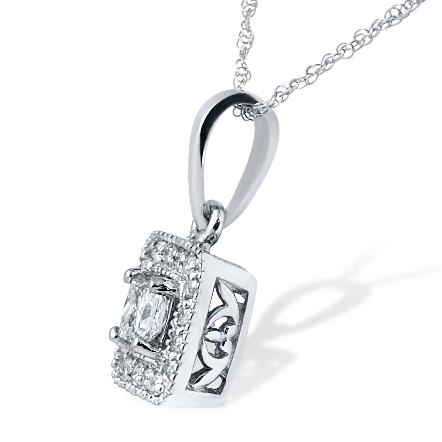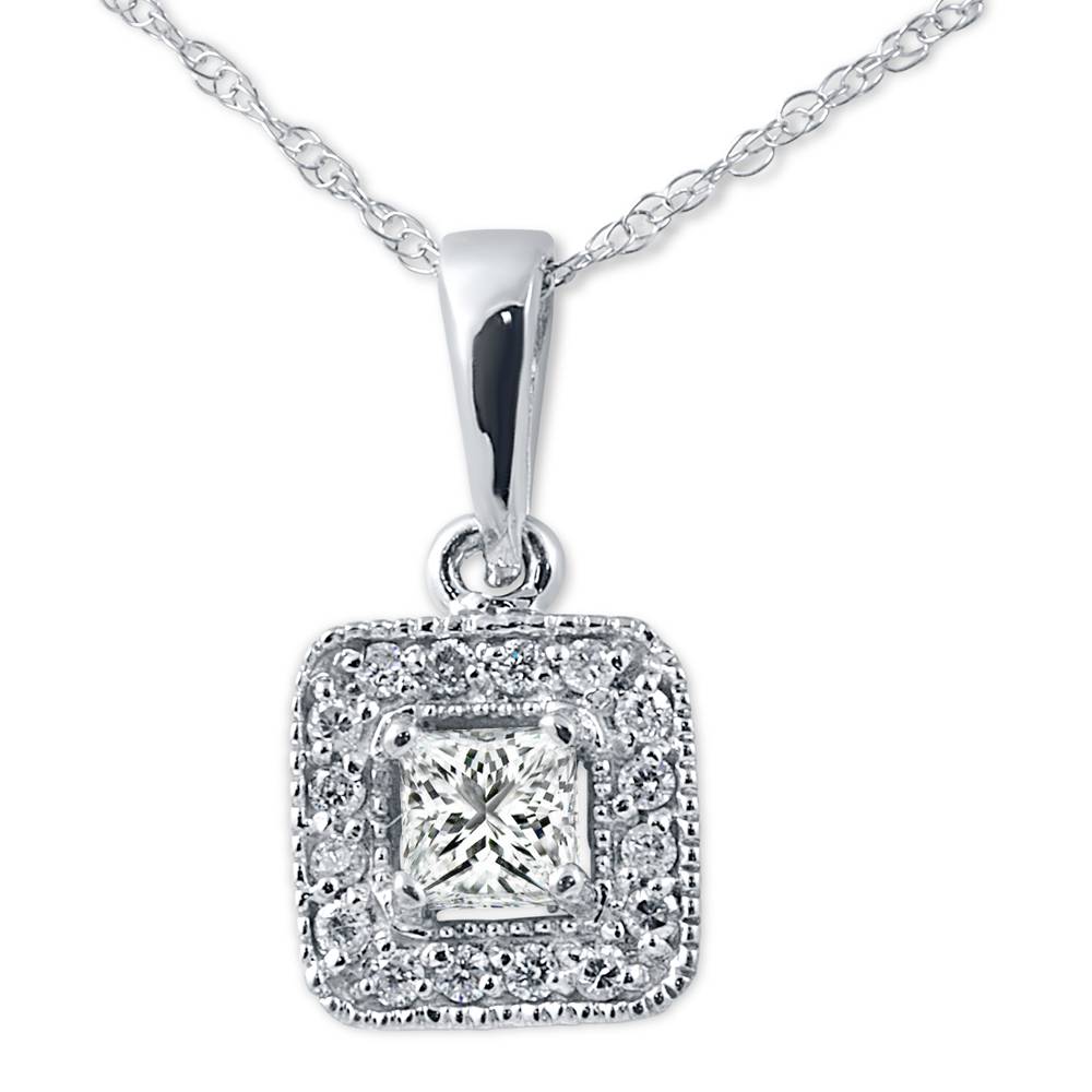This women's pendant features a 1/4ct princess cut diamond and 16 round cut diamonds set in solid 14k white gold. An 18" 14k white gold clasp lock chain is included.
