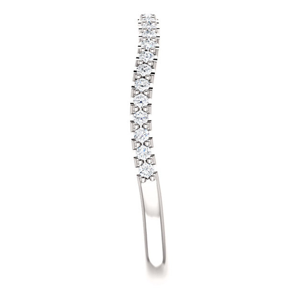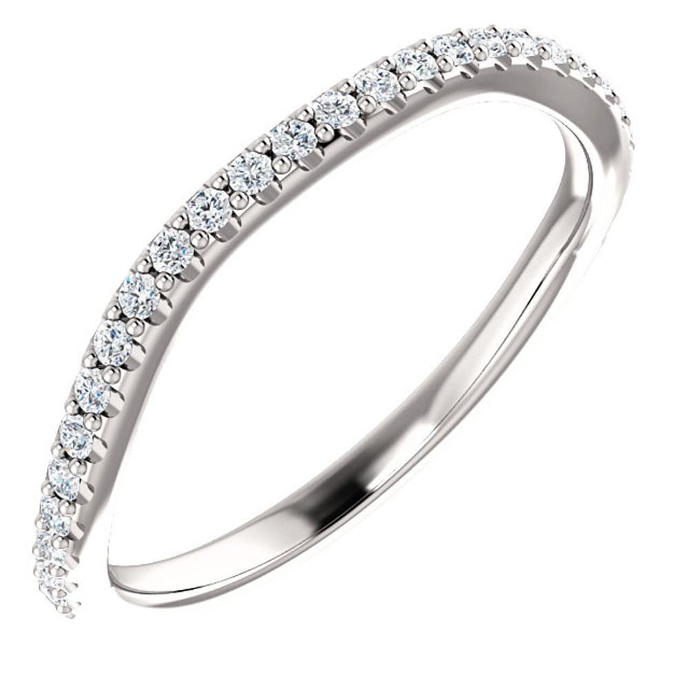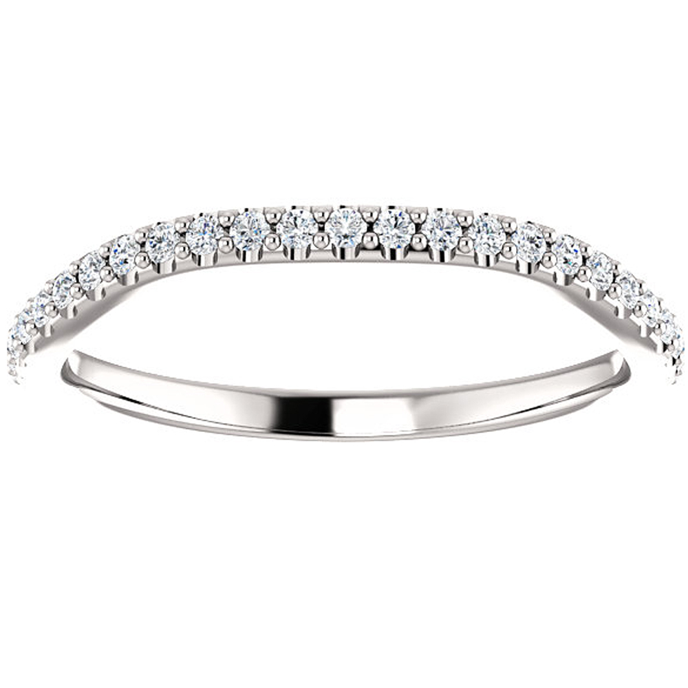 Women's curved contour ring features 27 round cut genuine diamonds. The diamonds are prong set in solid 14k white gold. The band has a slight curve to sit flush another ring.