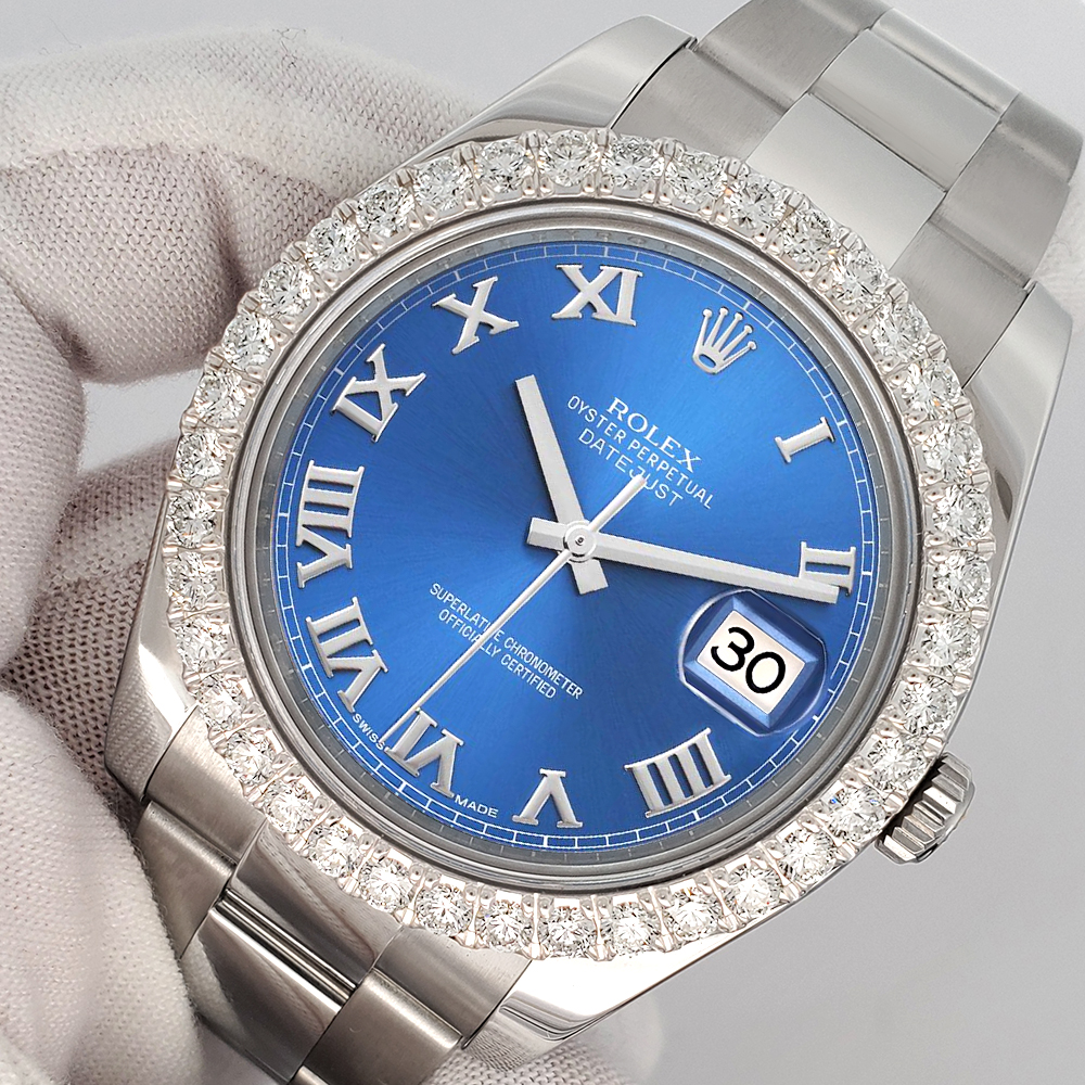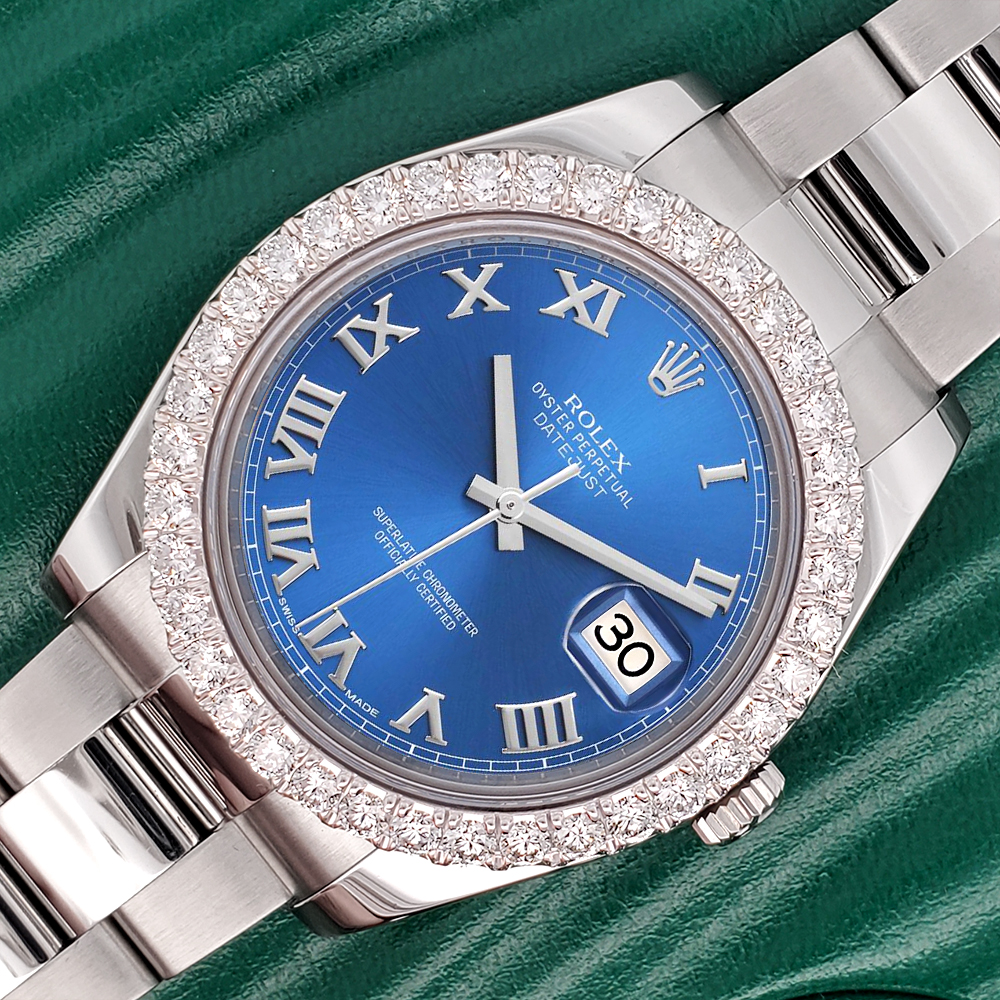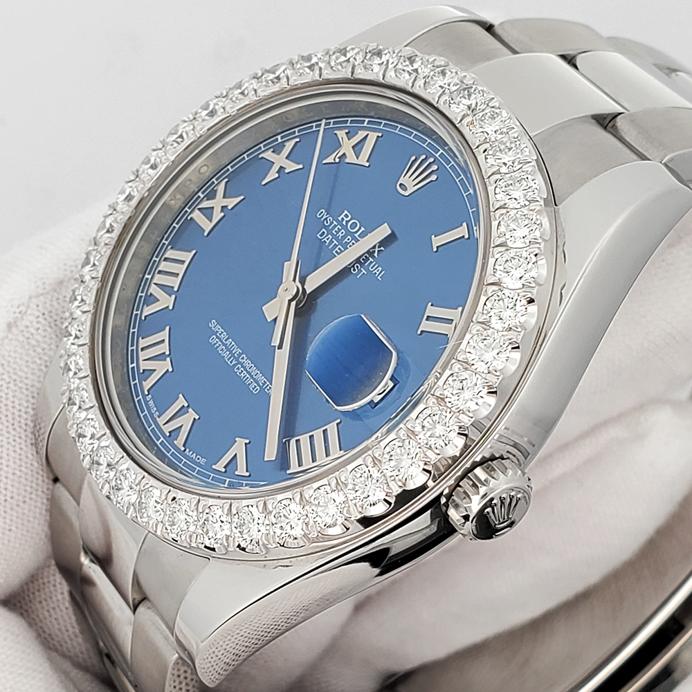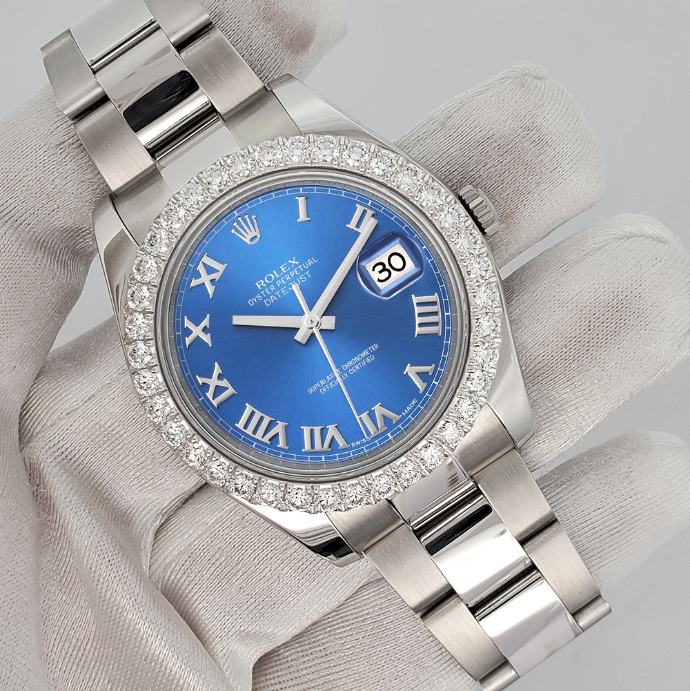 Rolex Datejust II 41mm 3.8ct Diamond Bezel/Blue Roman Dial Steel Watch 116300 Box Papers