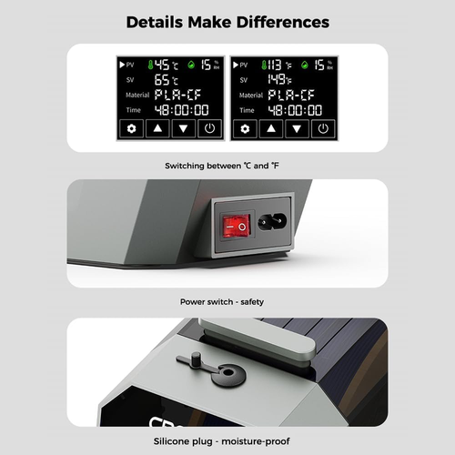 | 🔔【Ein-Tasten-Einstellung für Trockentemperatur, 48-Stunden-Timer-Funktion】Dieser Creality 3D-Filamenttrockner verfügt über Ein-Tasten-Temperatureinstellungen für verschiedene Filamenttypen und unterstützt bis zu 12 Filamenttypen, einschließlich PLA, ABS, TPU, PETG, PP, PC ,PA(Nylon),PET,PLA-CF,PA-CF,PETG-CF,ASA. Selbstverständlich können Sie die Temperatur auch stufenlos zwischen 45°C und 70°C einstellen. Die Heizdauer kann frei von 0 bis 48 Stunden eingestellt werden, sodass die Filamente vollständig getrocknet werden und bessere Druckergebnisse erzielt werden. |