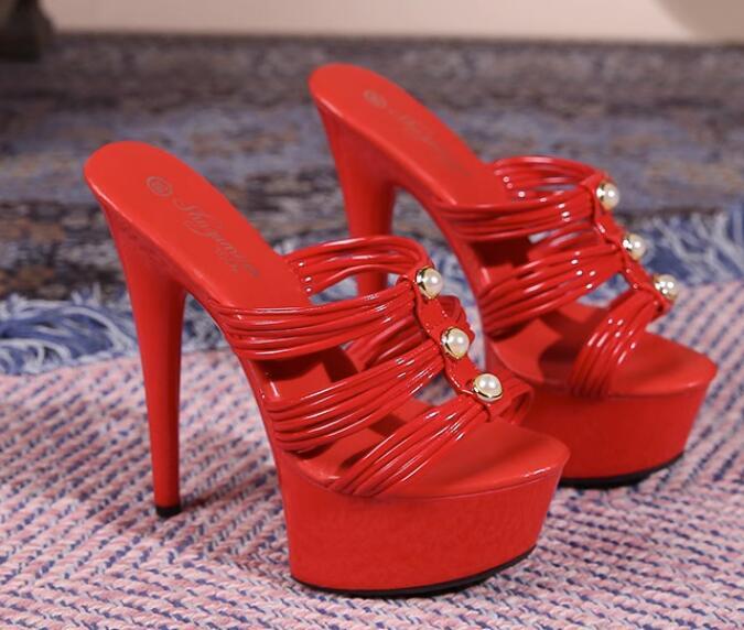 Womens Summer Peep Toe Pearls Slippers Pumps Fashion High Heels Platform Shoes