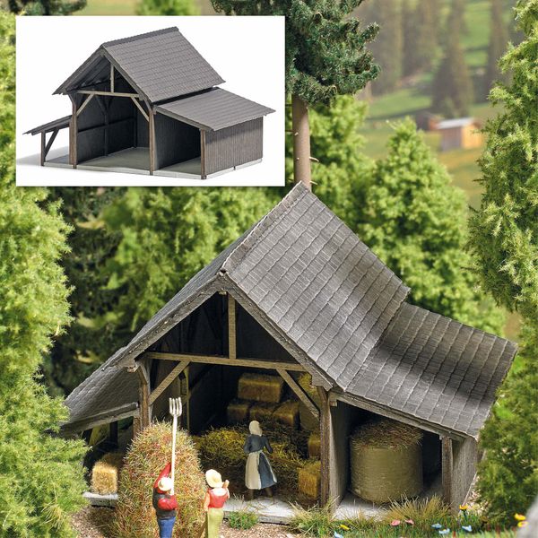 Bausatz für einen ländlichen Unterstand bzw. Heuschuppen. Mit Laubengang auf der linken Seite des Gebäudes sowie zwei Unterstellmöglichkeiten für landwirtschaftliche Fahrzeuge und Gerätschaften (Einfahrtshöhen 34 und 25 mm). Echte Holzkonstruktion, alle Teile fertig koloriert.