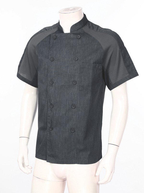 Unisex short sleeve chef coat, cross-over collar, contrast color details, the upper back is designed with breathable mesh patchwork panel.