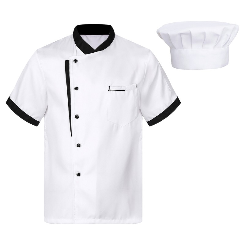 US Mens Chef Jacket Coat Uniform Kitchen Short Sleeve Jackets Work Cook,Top +Hat