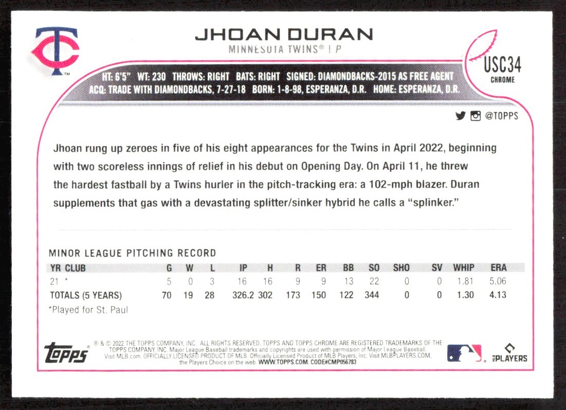 2022 10746B Topps Chrome Update Jhoan Duran Rookie Minnesota Twins #USC34