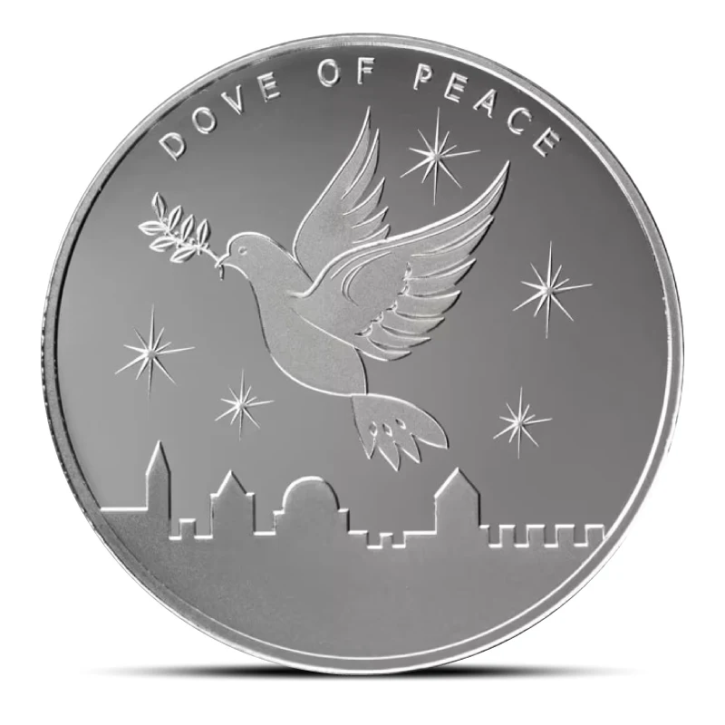The obverse of the 2024 1 oz Holy Land Mint Dove of Peace Silver Round depicts a dove in flight while it clenches on an olive branch in its beak. The dove and an olive branch are the symbols of peace. Below the flying dove, the historic and cultural old city of Jerusalem is depicted in a skyline. The inscriptions of “DOVE OF PEACE” are displayed along with the backdrop of some stars.