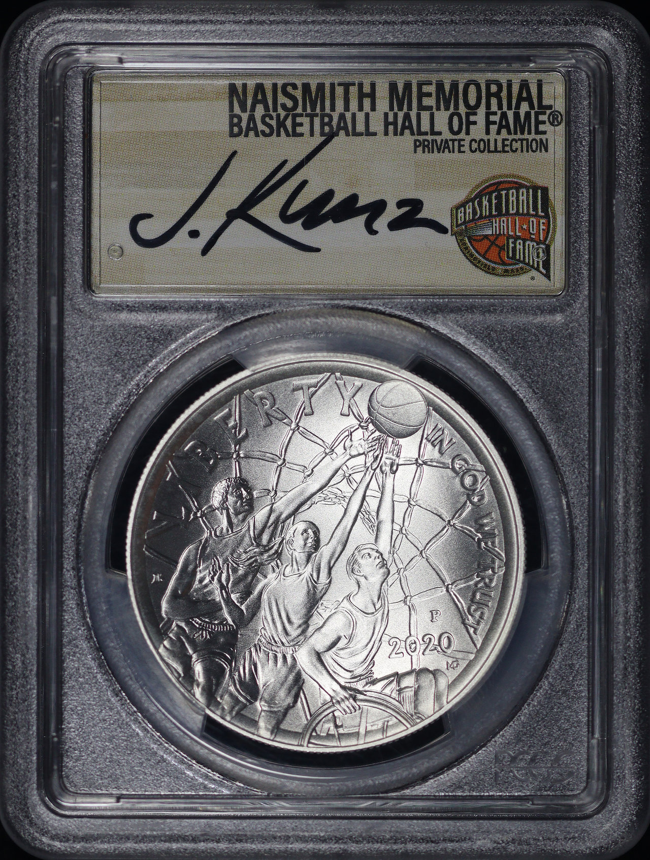 2020-P Basketball Hall of Fame Silver Dollar Commemorative PCGS MS-70 First Day Of Issue Justin Kunz Signature Label Naismith Memorial Private Collection. Both sides display faint milky spots.