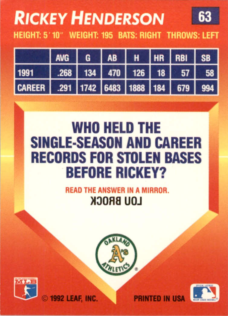 | 1992 Triple Play Rickey Henderson Oakland Athletics #63 Baseball Card |