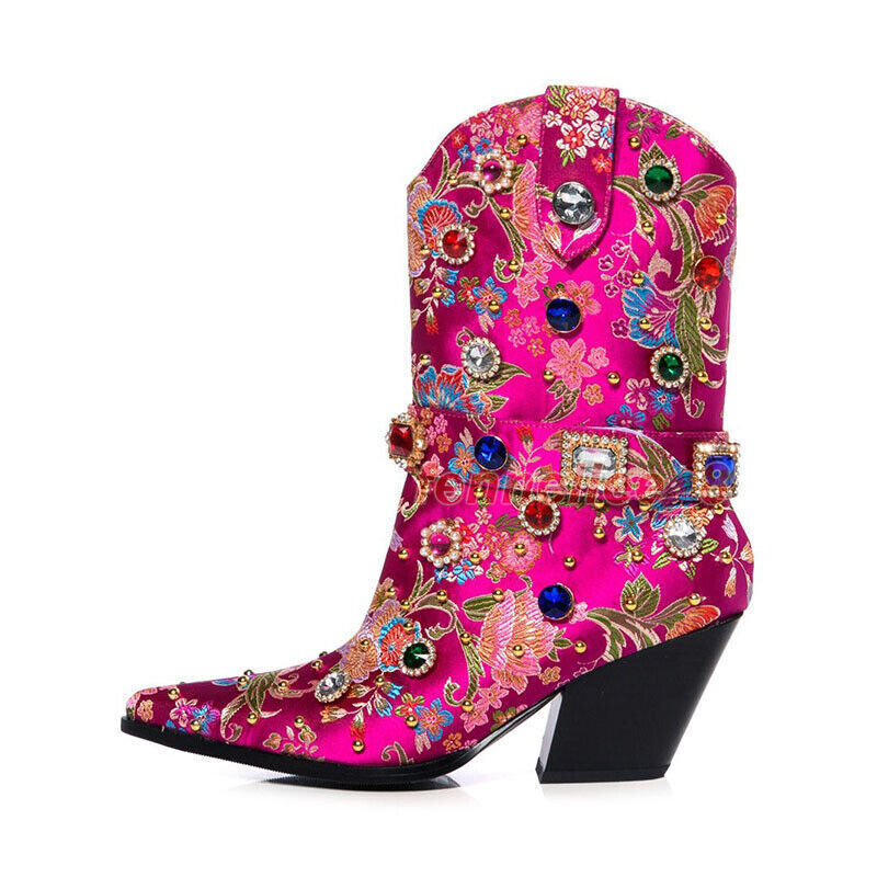 Ethnic Womens Boots Pointed Toe Chunky Heels Mid Calf Boots Rivet Rhinestone New