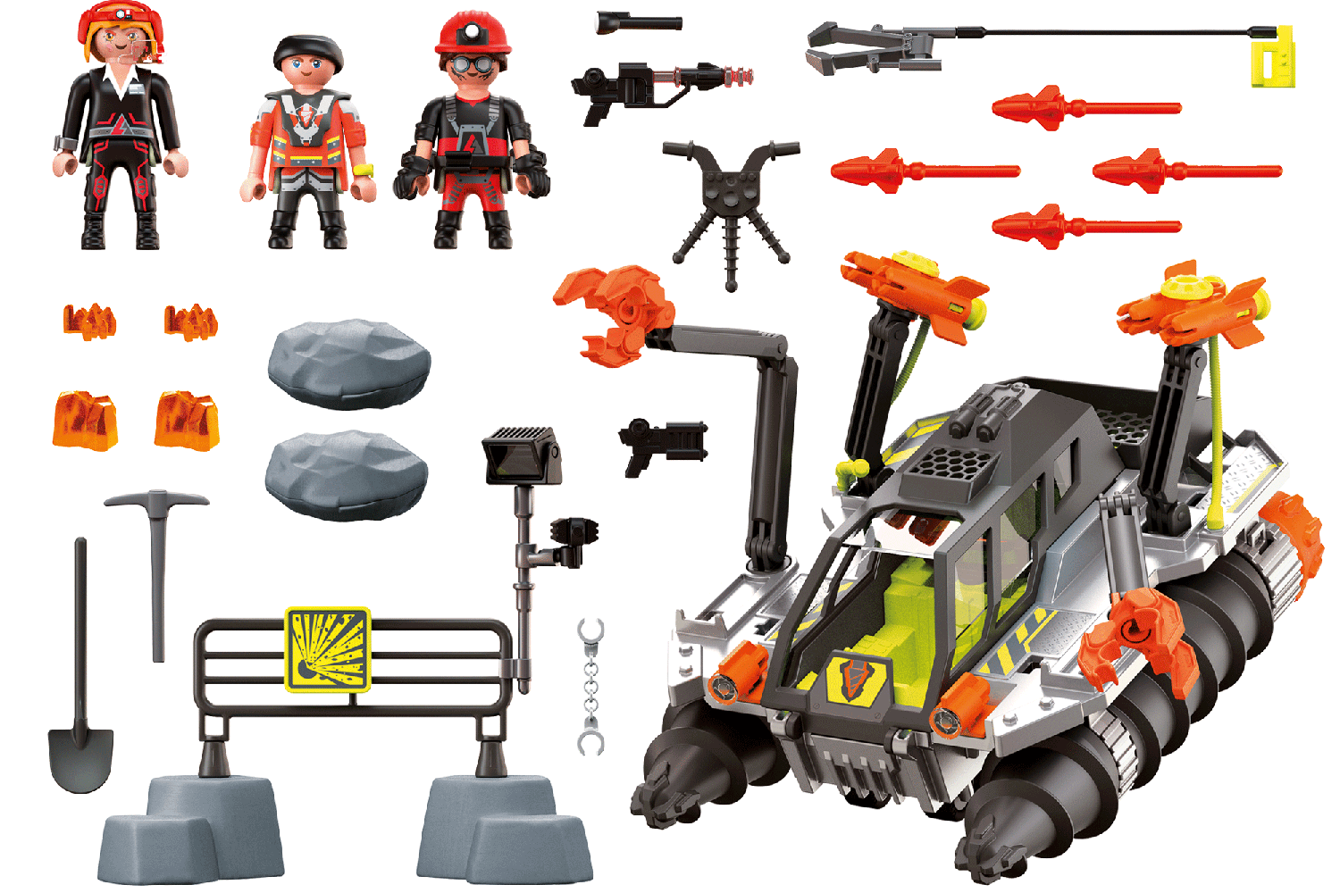 Mit ihrem starken Bohrfahrzeug bahnen sich die Schurken Ludmilla und Ralph von der Comet Corp. ihren Weg durch die Dino Mine. Die sich bei Bewegung drehenden Bohrköpfe, sowie zwei funktionale Kanonen und die flexiblen Greifarme bieten vielfältigen Spielspaß auf der Suche nach Energiesteinen und der Lavaquelle. Inkl. 3 Figuren, Energiesteinen und weiteren Accessoires Maße: 21 x 15 x 9,5