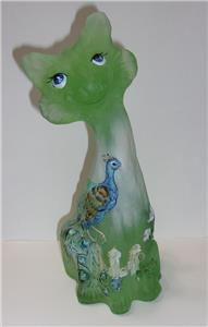 This gorgeous alley cat was offered as a Gift Shop Exclusive in 2024 and made in very limited numbers! It is made of apple green satin glass (by Mosser Glass) and hand painted with a regal peacock in vibrant blue and aqua tones. There is also an ornate white fence and some scroll details. On the side and back are pretty pink and white florals and the cat has deep blue eyes! It is signed by Fenton artist and designer M Kibbe, dated 2024 and numbered #36/49. It stands about 11" tall and and is a first quality piece in as new, excellent condition. It would make a wonderful gift for your favorite cat or bird lover!
