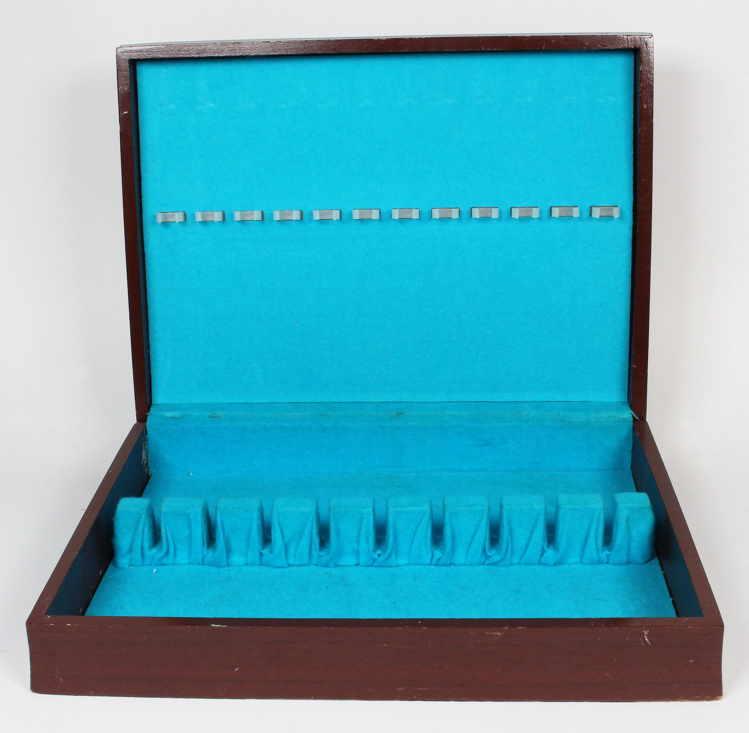 Vintage silverware storage chest with blue fabric. The chest features a wooden design, and 21 slots. The box has some scratches, wear, and has a few small holes on the back, but the chest is still fully functional. It measures 10.75″ x 14.5″ x 2.75″ and weighs 2 LBS 68 oz.