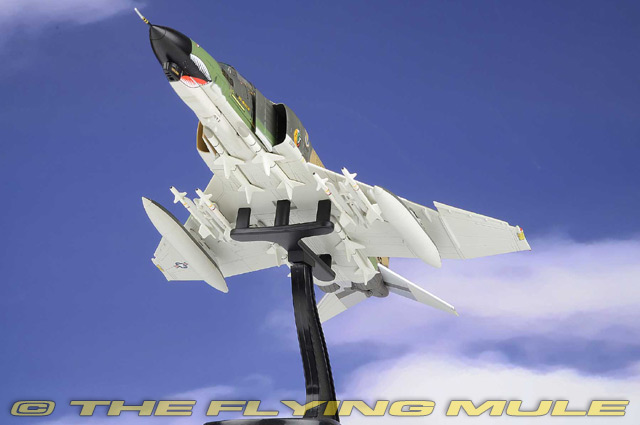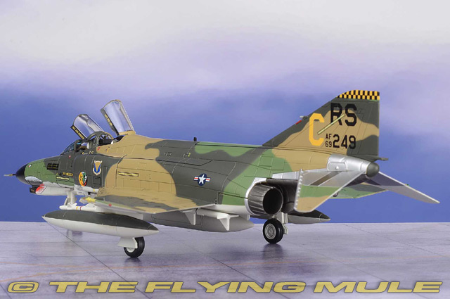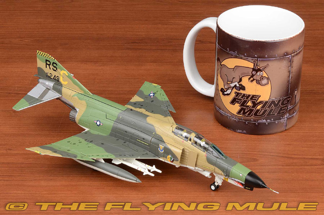 The 526th Fighter Squadron was activated in 1943 an flew combat missions in North Africa and Europe during WWII. The squadron was reactivated in 1946 at Nordholz Airbase, Germany, equipped with surplus P-47 Thunderbolts. By 1960 it had been redsignated the 526th Fighter-Interceptor Squadron (FIS), flying the F-102 Delta Dagger. In 1968 the squadron was assigned to the new 26th Tactical Reconnaissance Wing at Ramstein. With the phaseout of the F-102 from Europe, the 526th FIS was redesignated the 526th Tactical Fighter Squadron (TFS) and began converting to the F-4E Phantom II. It flew the F-4E for 17 years before upgrading to the F-16 Fighting Falcon in 1985. McDonnell Douglas F-4E Phantom IIDesigned as a fleet defense fighter for the US Navy, the F-4 Phantom was first flown on May 27, 1958. This twin-engine, long-range all-weather fighter/bomber proved highly adaptable and served in the Marine Corps and the US Air Force as well as in the Navy. During the Vietnam War, it was the principal air superiority fighter for the Navy and the Air Force and was also used for reconnaissance and ground attack. The Phantom continued to serve well into the 1970s and 1980s and even flew missions during the first Gulf War. Finally phased out by the F-14, F-16 and F/A-18, the Phantom was retired in 1996.© Copyright 2003-2026 The Flying Mule, Inc. Hobby Master's 1:72 scale F-4 Phantom II is highly detailed and very popular among collectors. This model has an intricately crafted fuselage, with rear and forward canopies that open to expose cockpit interior details such as instrument panel dials, control stick and ejector seat handles. The solid metal wing has raised wing-tips and a dog-toothed leading edge that blends seamlessly into the fuselage. Each release includes a full complement of removable ordnance. Variants in this series have notable differences in the nose and/or tail fin and slight variations in the engines' exhaust. Carrier-based variants have elevators with a raised leading edge, and land-based variants have standard leading edges. © Copyright 2003-2026 The Flying Mule, Inc. Hobby Master 1:72 Air Power SeriesThe Hobby Master "1:72 Air Power Series" range presents detailed, ready-made diecast models of military aircraft.Hobby Master "1:72 Air Power Series" diecast airplanes feature: