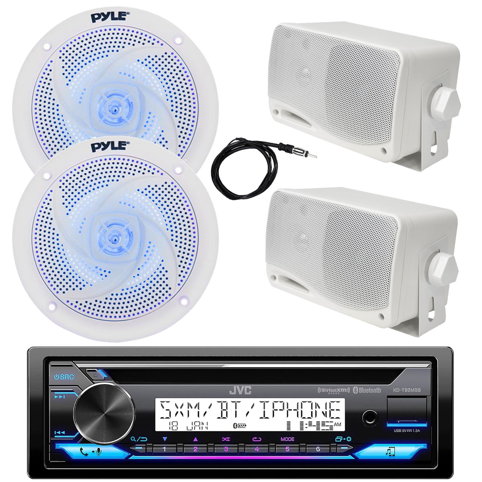 JVC KD-T92MBS Single DIN Bluetooth Marine AM/FM CD Stereo Receiver, 2x 5.25" 180 Watt Max 2-Way Low Profile Blue Flashing LED Boat Speakers, 2x 3.5'' 200 Watt 3-Way Box Speakers (White), 22" Antenna
