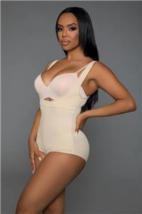 - Description: Bodysuit shaper features thick adjustable straps, an open lifting bust and a front zipper closure. Bra not included.