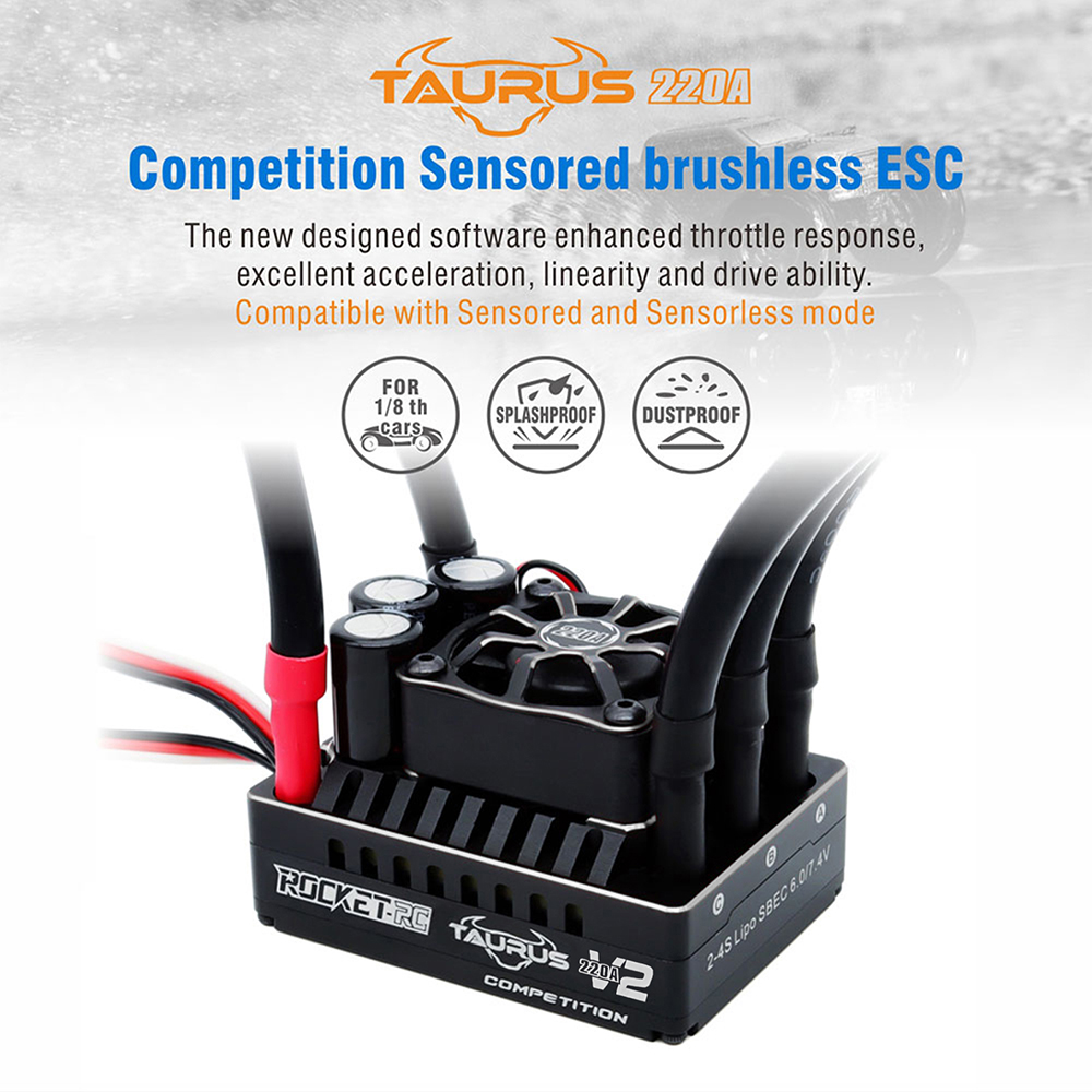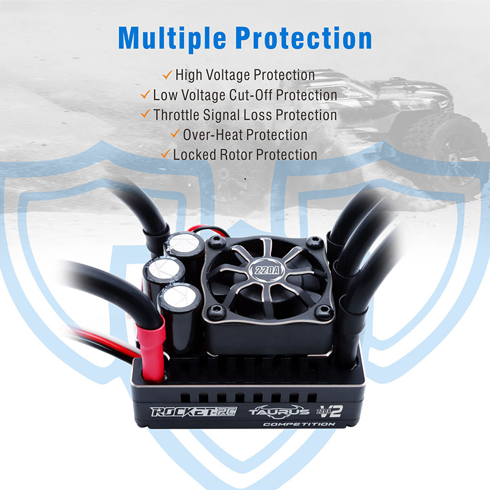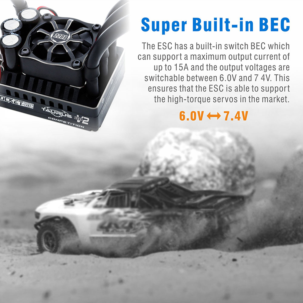 Splash-proof and dust-proof for all-weather races. For 2-4S Lipo or 4-12 cells NiMH. Super bulit-in BEC output 7.4V/6A. Compatible with 1/8 RC Truck, Buggy, Truck, Rock Crawler.