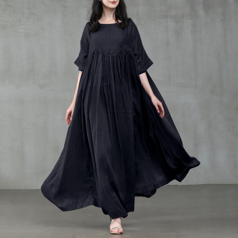 Womens Short Sleeve Cotton Linen Loose Waist Party Swing Maxi Dress S-5xl