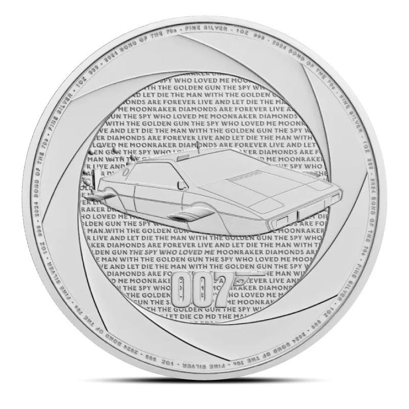 The “Wet Nellie” in the center is the iconic custom-made submarine from the Lotus Esprit S1. The thick edge of the design is bullet-shaped, bearing imprints of purity, year of issue, and weight, as shown in “2024 BOND OF THE 70s. FINE SILVER. 1 OZ 999.”