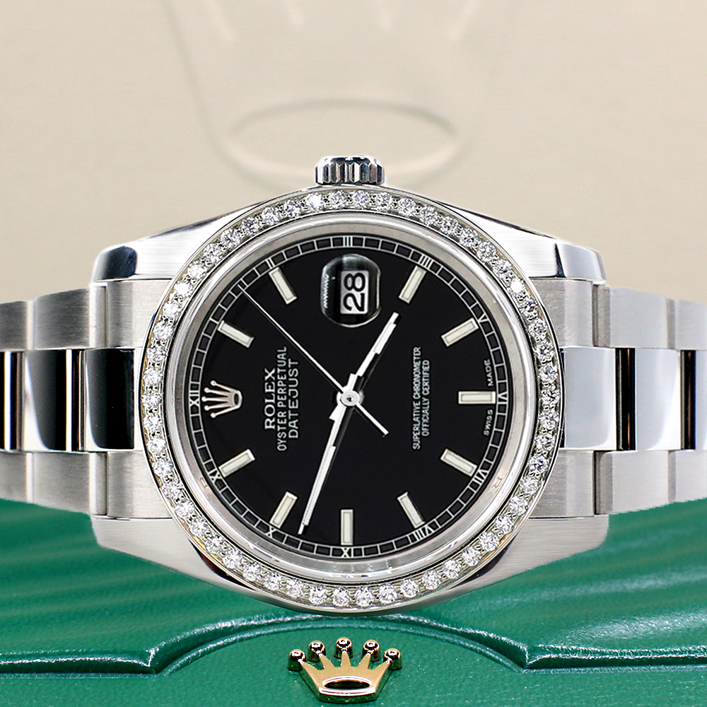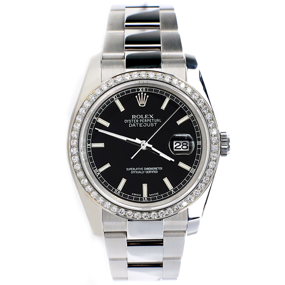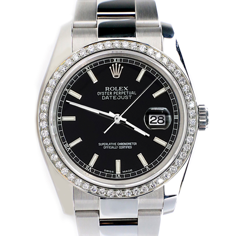 Rolex Datejust 36mm Stainless Steel oyster Watch, ref #116200. Factory black stick dial. Custom 1.1ct VS1 diamond bezel (diamonds are not set by Rolex).