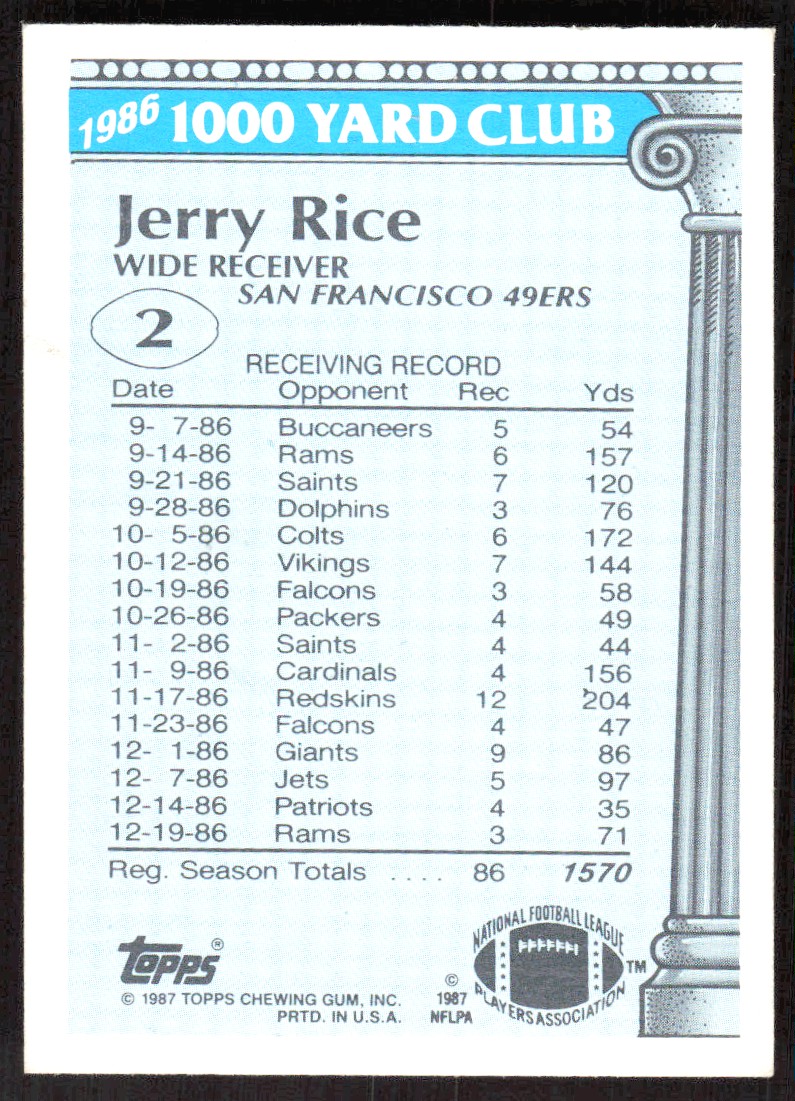 1987 5468C Topps 1000 Yard Club Jerry Rice San Francisco 49ers #2