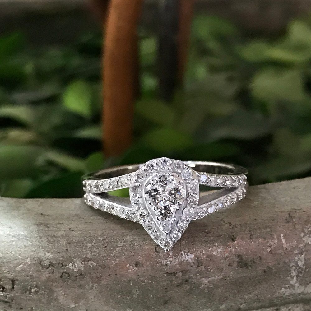 Womens ring features 45 round cut diamonds. All diamonds are set in solid 14k white gold. The engagement ring has a pear shape made of round pave cluster diamonds. The band has a slpit giving it a bit more width and perfect amount of sparkle.