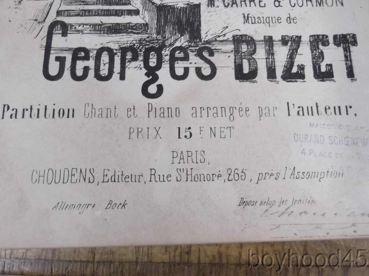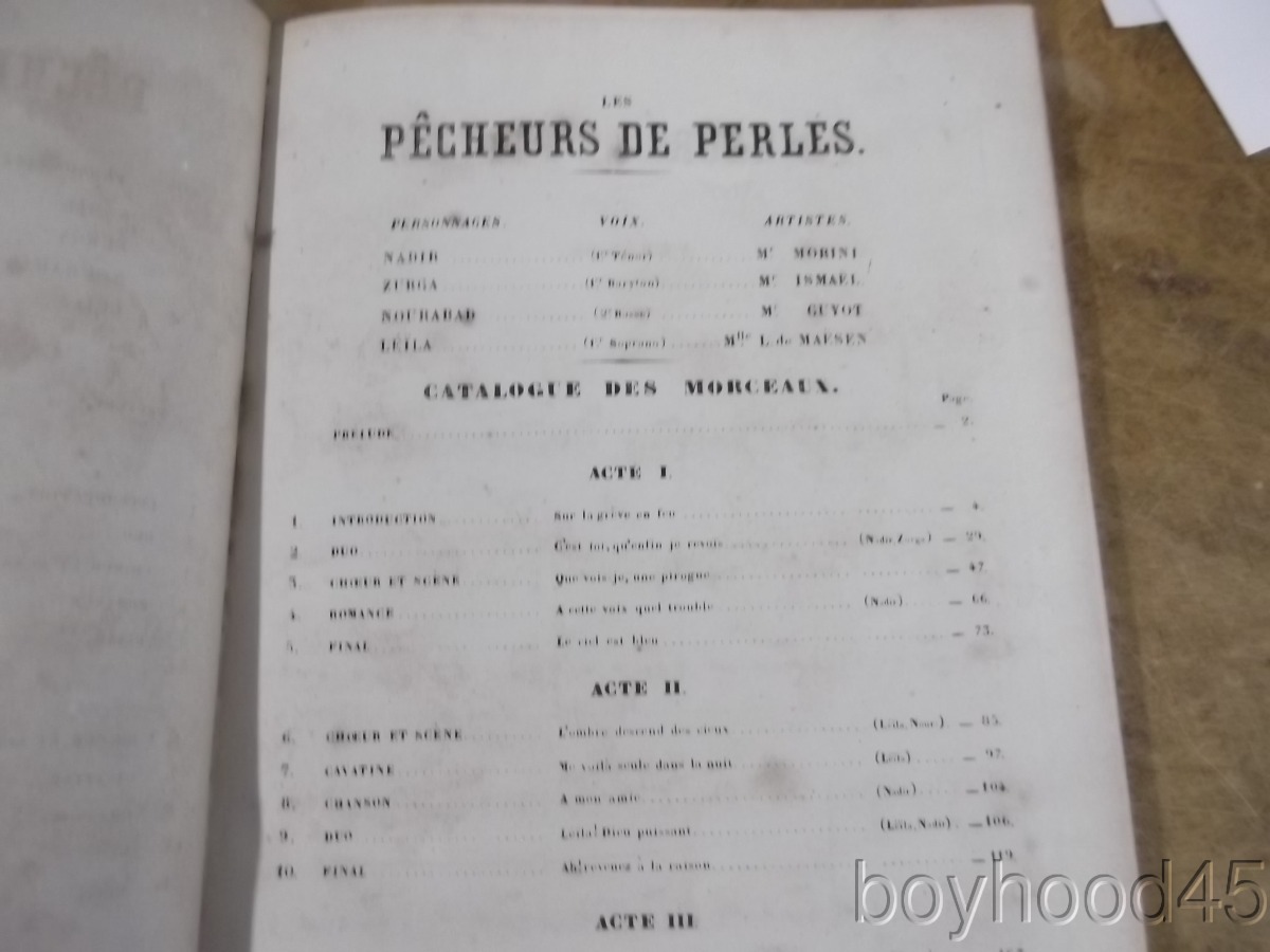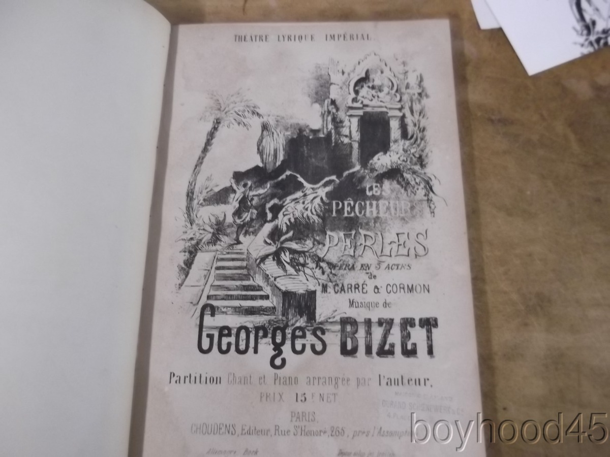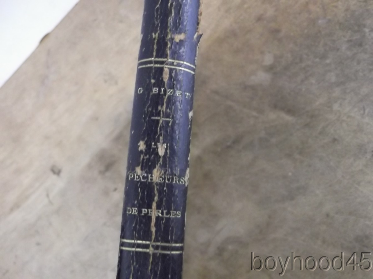 I have acquired an extensive collection of books, classical and operatic sheet music and opera scores from the estate of noted opera historian and musicologist, Michael Kaye. This is a wonderful item. It is a First Edition, First Issue of "Les Pecheurs De Perles (The Pearl Fishers), Opera en 3 Actes, by G. Bizet. Piano and vocal score. Published by Choudens, Editeur, Paris, 1863. Plate #992. There are indentations in all margins. This is the earliest edition of this score containing publisher mis-pagination (1-88, then 85-211). Bound in full black leather with facsimile of Bizet's signature on the front cover. Gilt page edges all around. Shows wear to corners and spine. Wear and leather loss to spine ends. Shows intermittent page darkening in spots. Otherwise, a clean, unmarked copy that I will call Very Good. Book measures 7 3/8 X 11, 211 pages. PLEASE NOTE: This book was sold in a Lisa Cox sale in 2007 and sold for $650 British Pounds!!!!!!!!!!!!!!!!!!!!!!!!!!!!!!!!! I will offer this nice copy for only $500.00 plus $6.00 S&H in the US. (Rm 1, L, Case 5, Shelf 1)