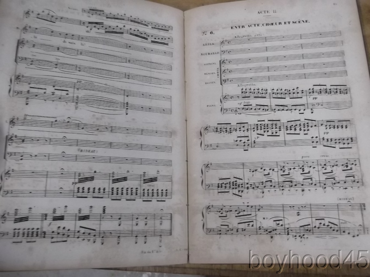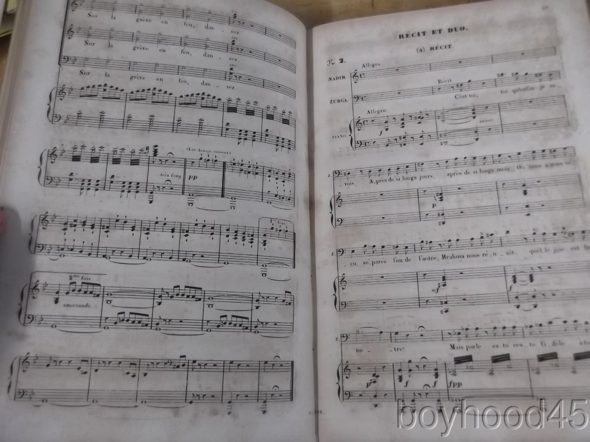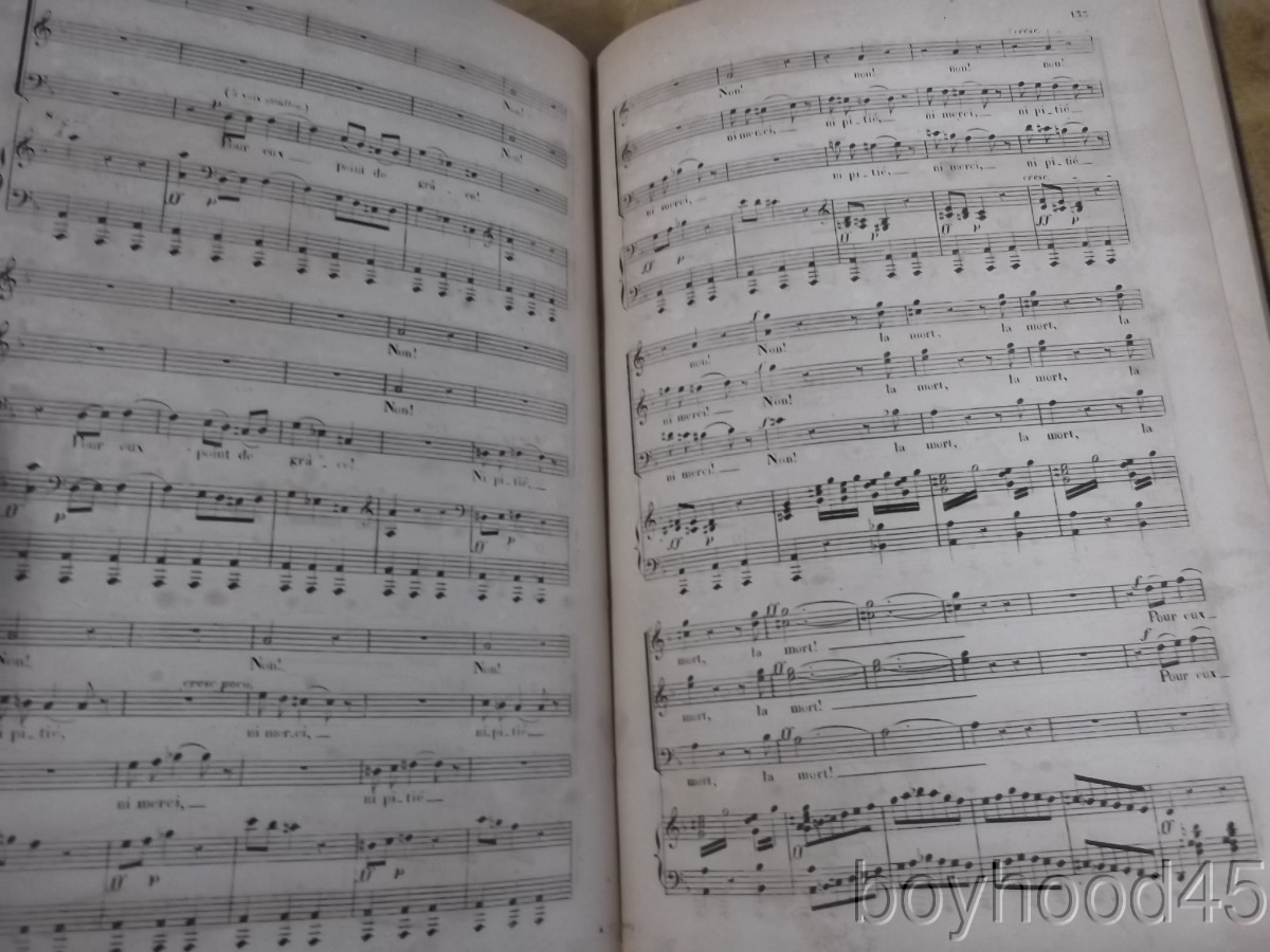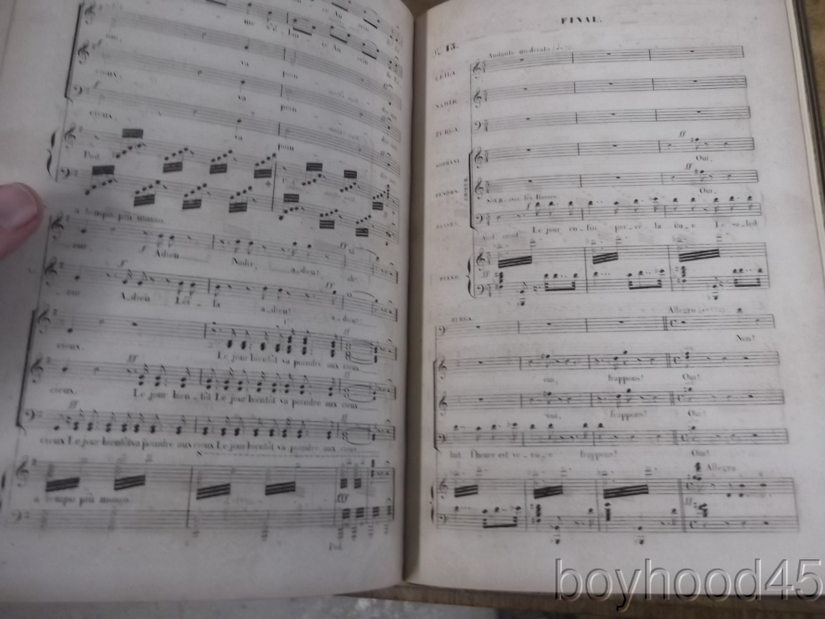I have acquired an extensive collection of books, classical and operatic sheet music and opera scores from the estate of noted opera historian and musicologist, Michael Kaye. This is a wonderful item. It is a First Edition, First Issue of "Les Pecheurs De Perles (The Pearl Fishers), Opera en 3 Actes, by G. Bizet. Piano and vocal score. Published by Choudens, Editeur, Paris, 1863. Plate #992. There are indentations in all margins. This is the earliest edition of this score containing publisher mis-pagination (1-88, then 85-211). Bound in full black leather with facsimile of Bizet's signature on the front cover. Gilt page edges all around. Shows wear to corners and spine. Wear and leather loss to spine ends. Shows intermittent page darkening in spots. Otherwise, a clean, unmarked copy that I will call Very Good. Book measures 7 3/8 X 11, 211 pages. PLEASE NOTE: This book was sold in a Lisa Cox sale in 2007 and sold for $650 British Pounds!!!!!!!!!!!!!!!!!!!!!!!!!!!!!!!!! I will offer this nice copy for only $500.00 plus $6.00 S&H in the US. (Rm 1, L, Case 5, Shelf 1)