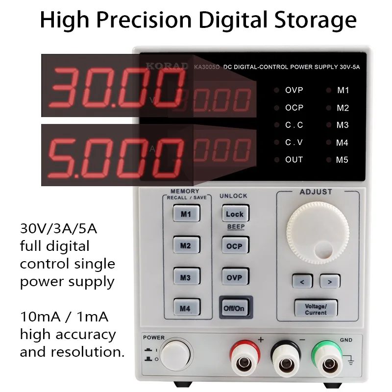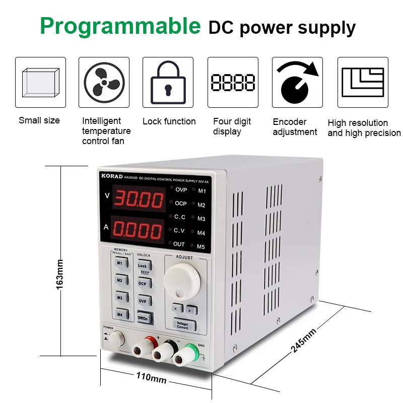 30V/5A full digital control single power supply 10mV/1mA high accuracy and resolution Low noise and ripple CV/CC constant voltage and constant current mode Highly reliable OCP, OVP, arbitrary setting protection Built-in 10 sets of parameter storage Output switch control Power-off memory function Keyboard lock prevents misoperation Intelligent temperature control fan, effectively reduce noise Easily replace traditional digital display power supply Accurately generate the required voltage and current 0-30V high precision adjustable DC output 10mV and 1mA resolution