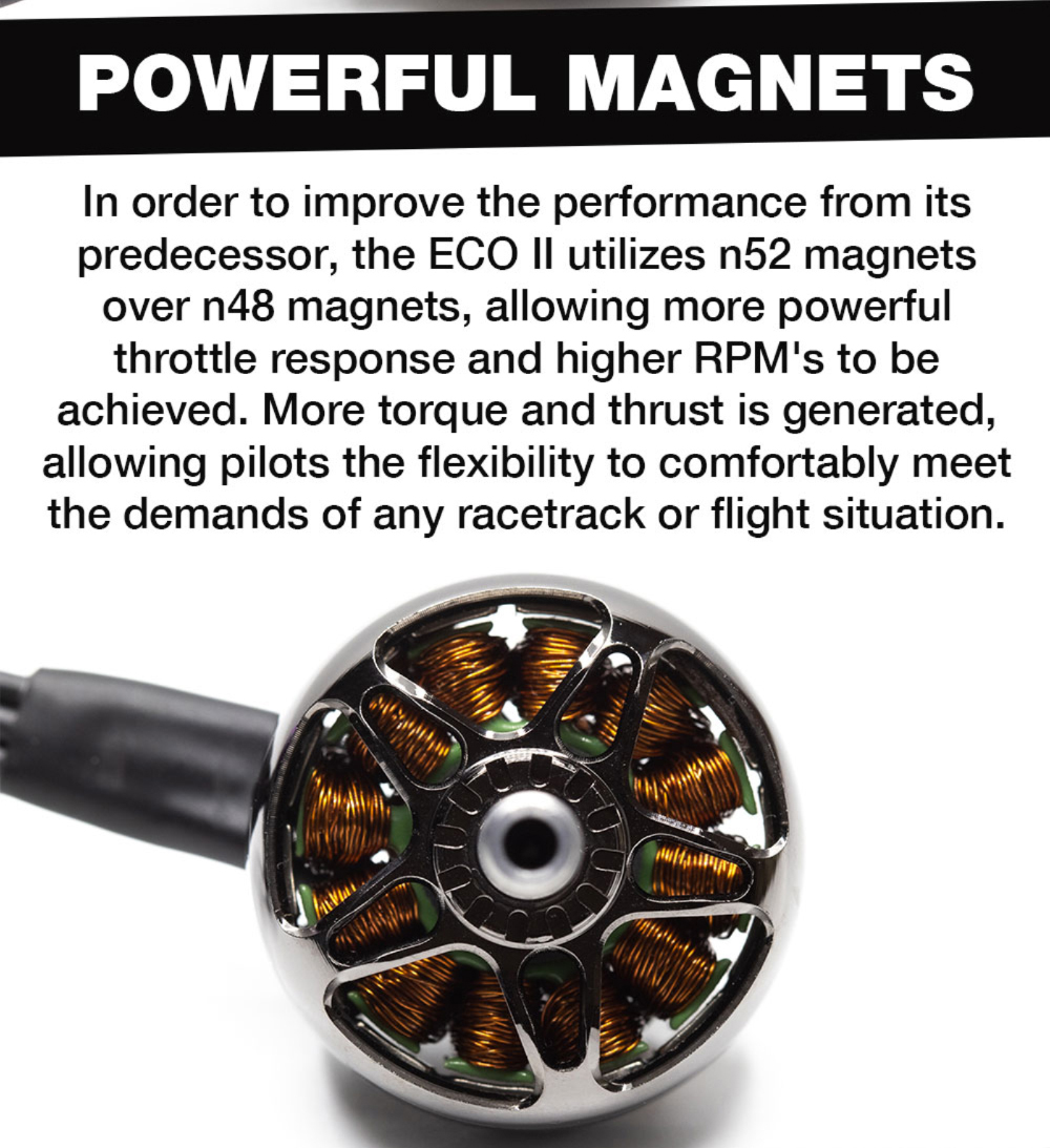 ECO utilizes n52 magnets over n48magnets , allowing more powerfulthrottle response and higher RPM'S.