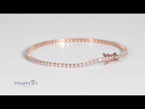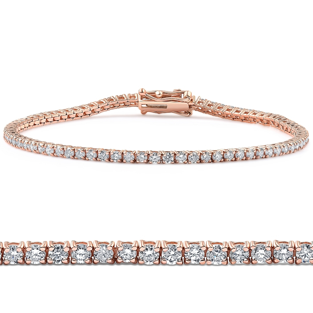 This classic style tennis bracelet features round brilliant cut lab-grown diamonds. All diamonds are prong-set in 14k rose gold. The bracelet is secured by a double lock. Measure a standard 7 inch length.