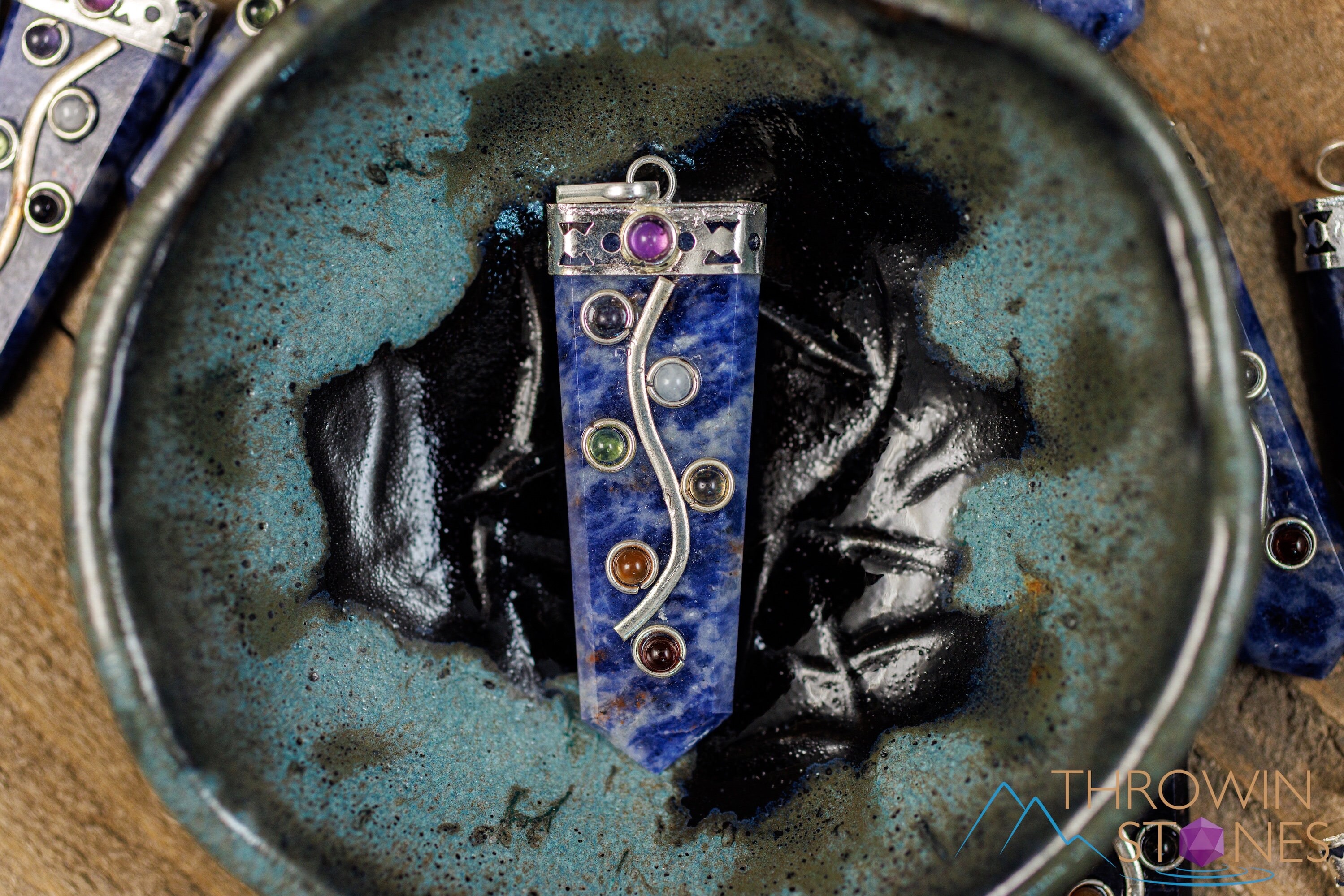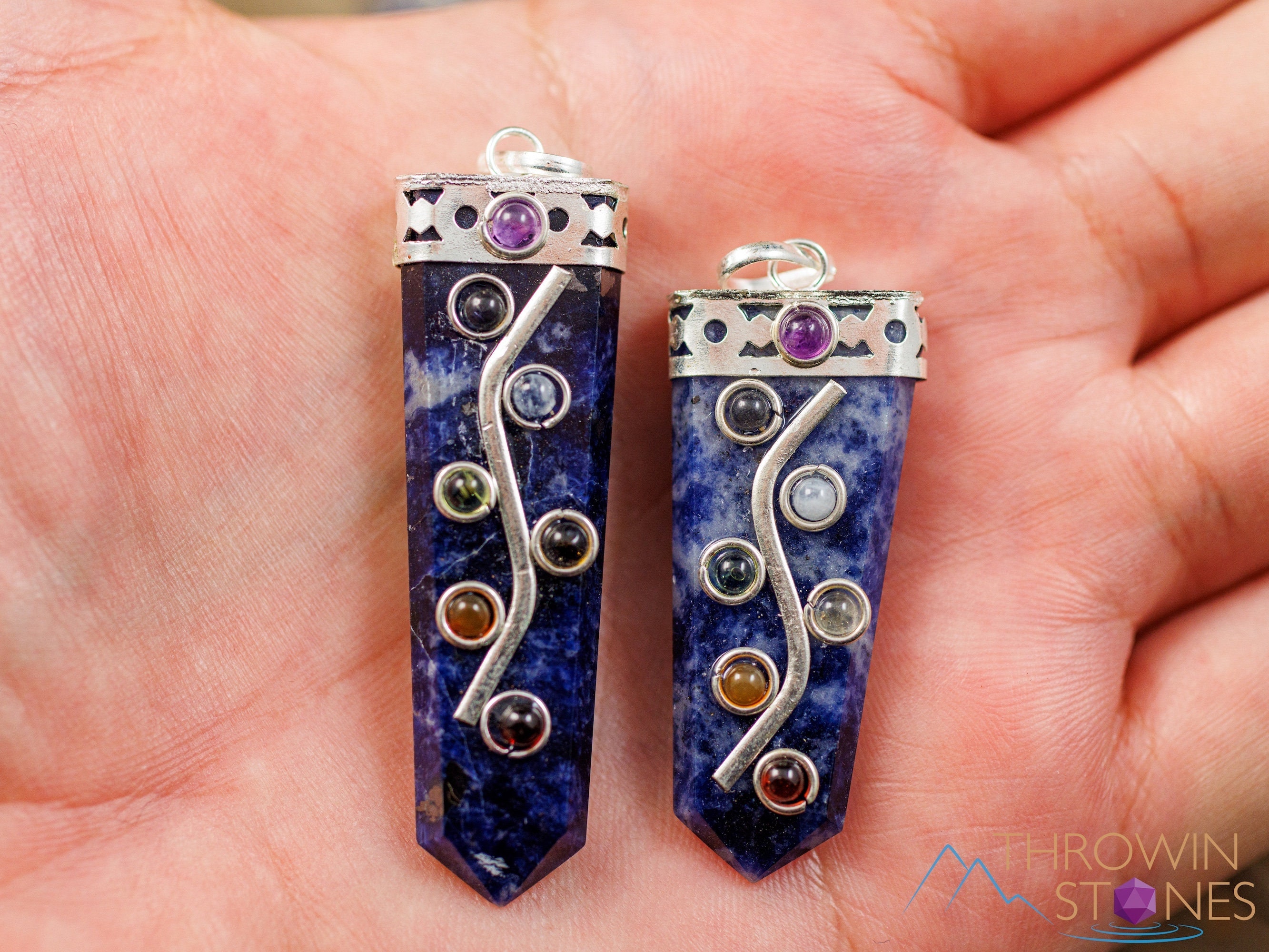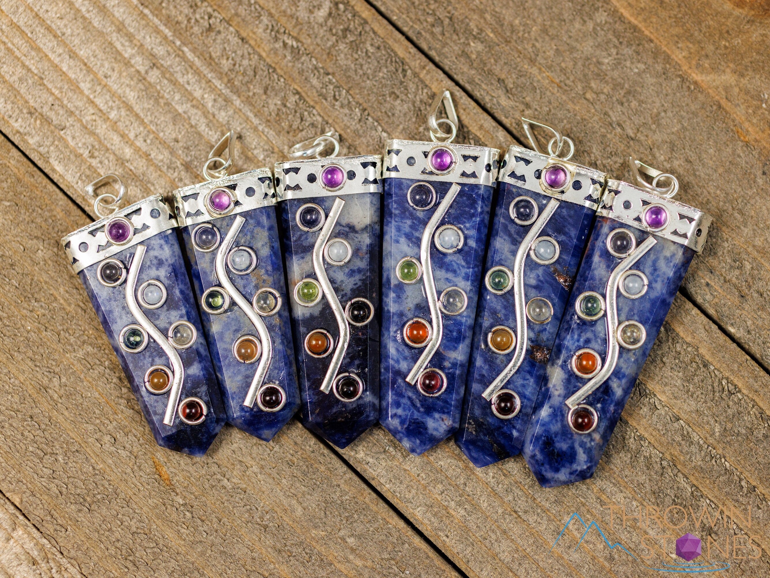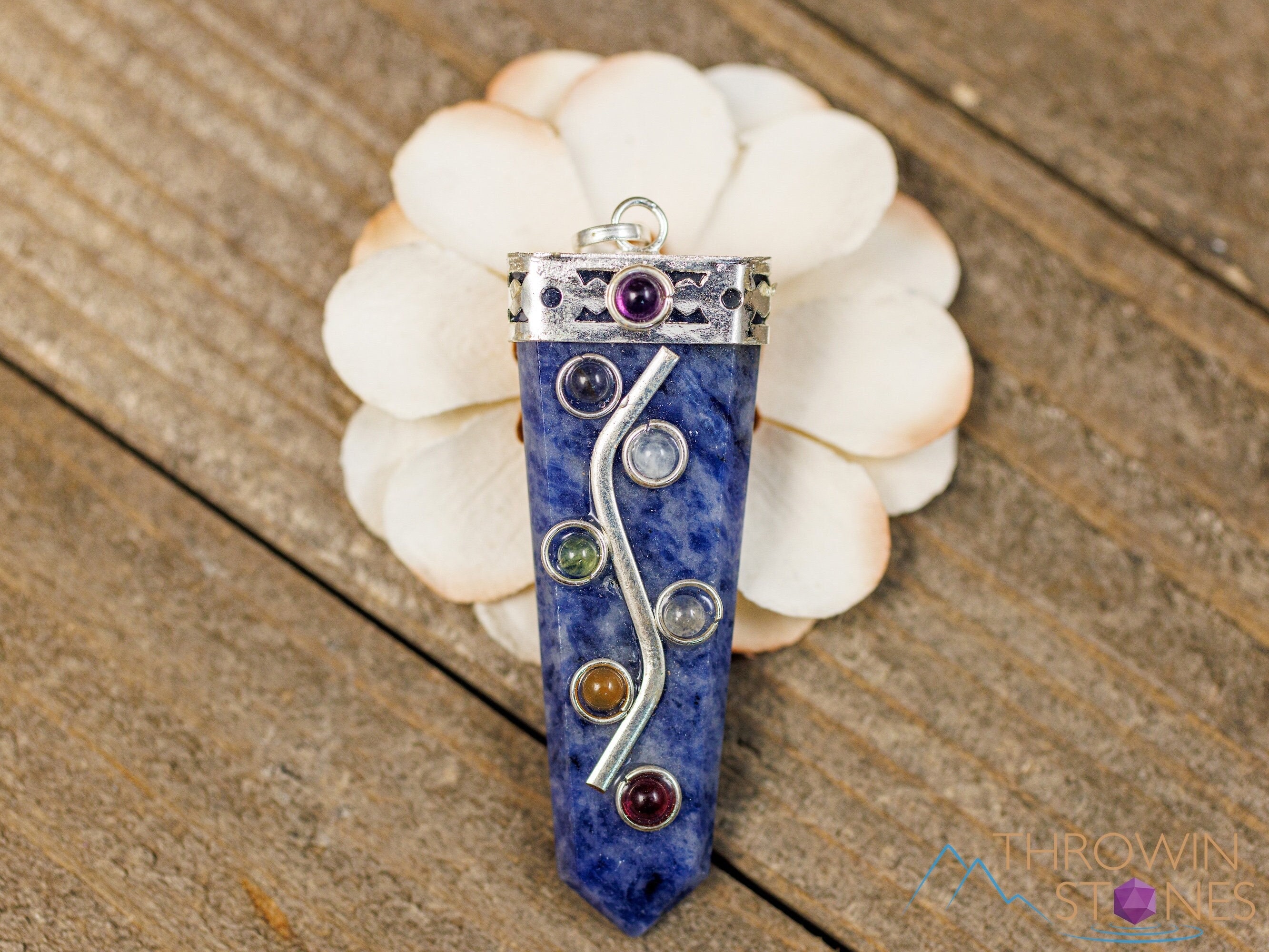 This pendant features seven stones that connect with the seven chakras: Amethyst, Iolite, Moonstone, Peridot, Citrine, Carnelian, and Garnet, aligned atop a Sodalite crystal point.