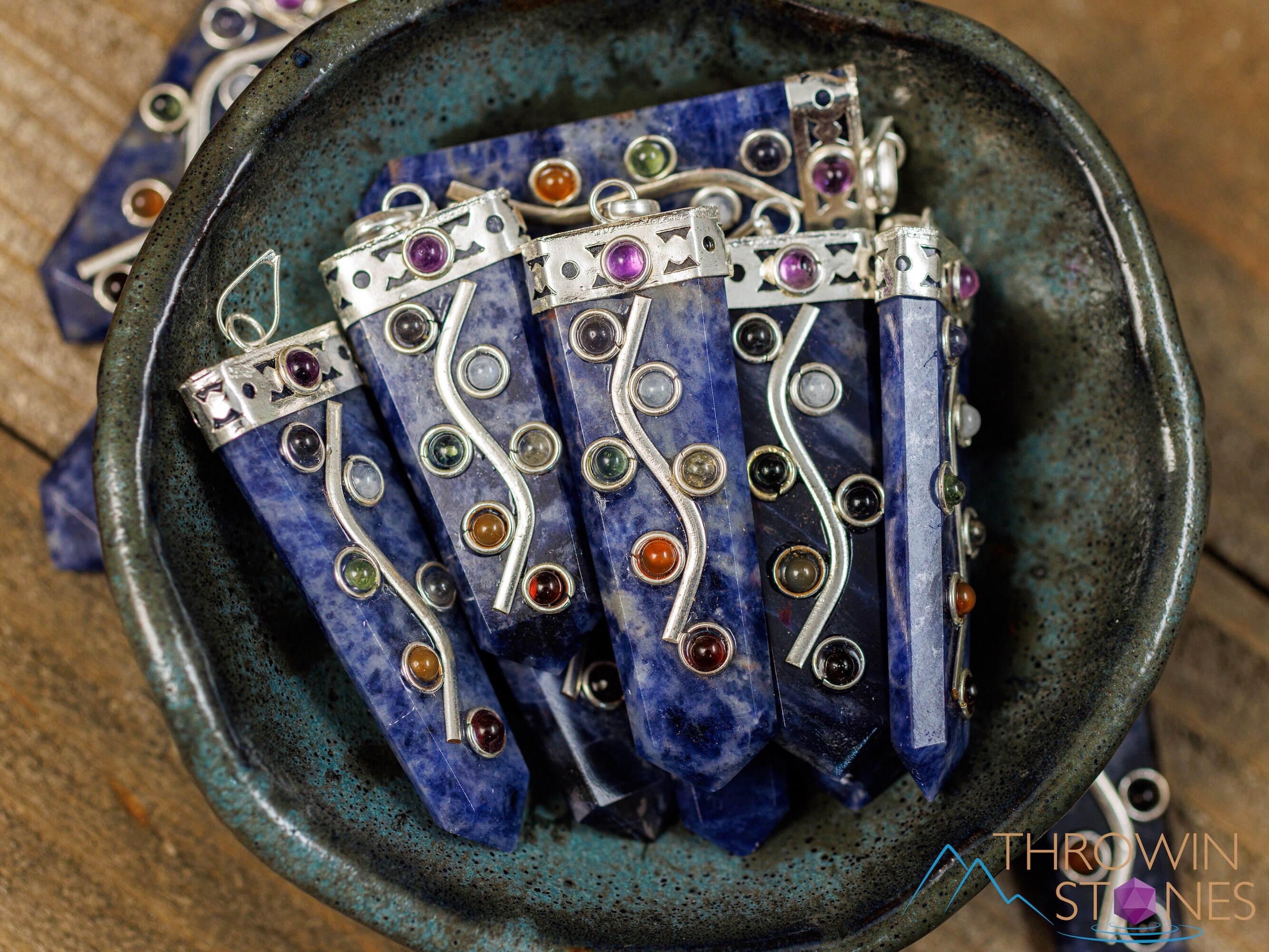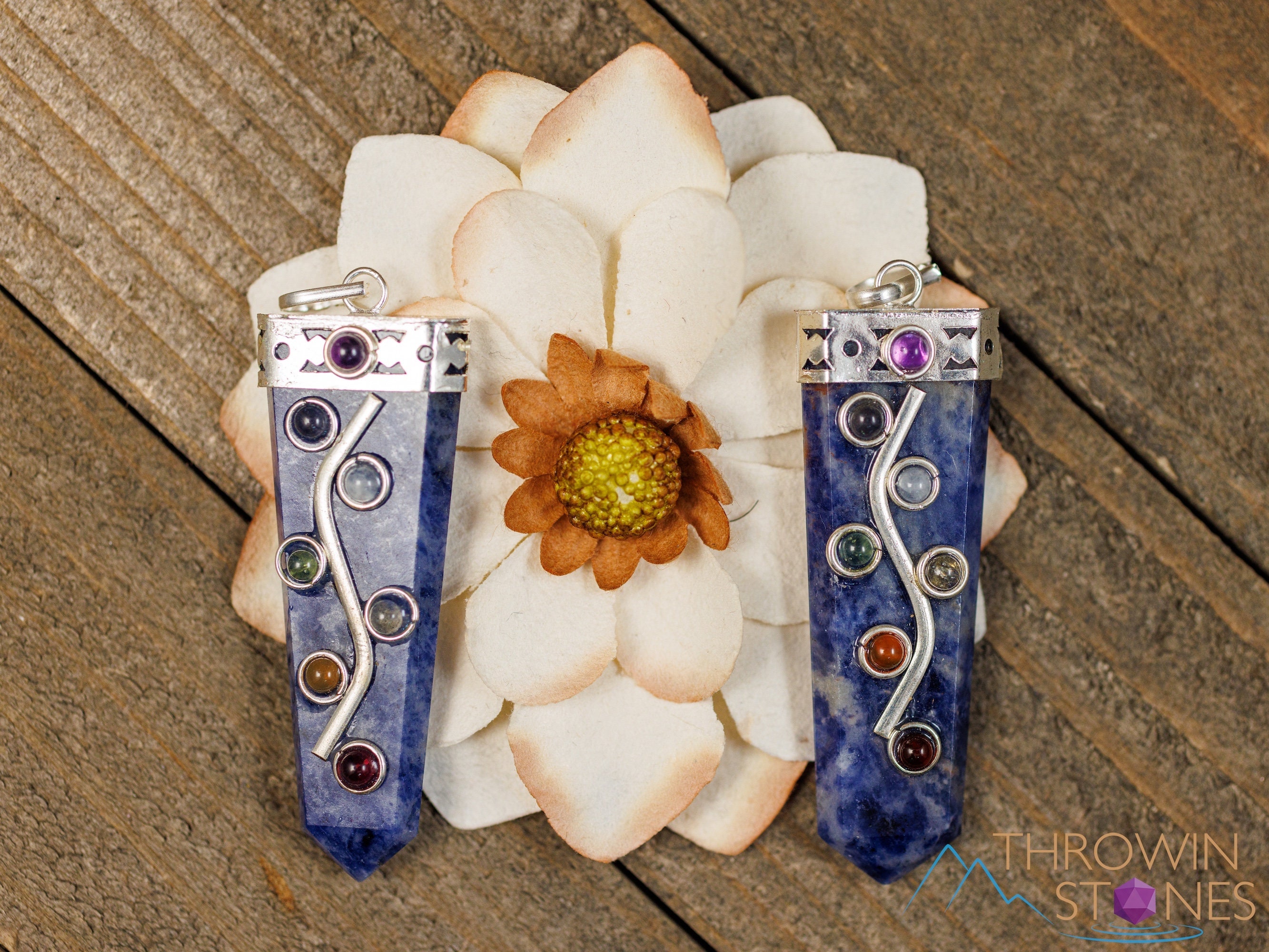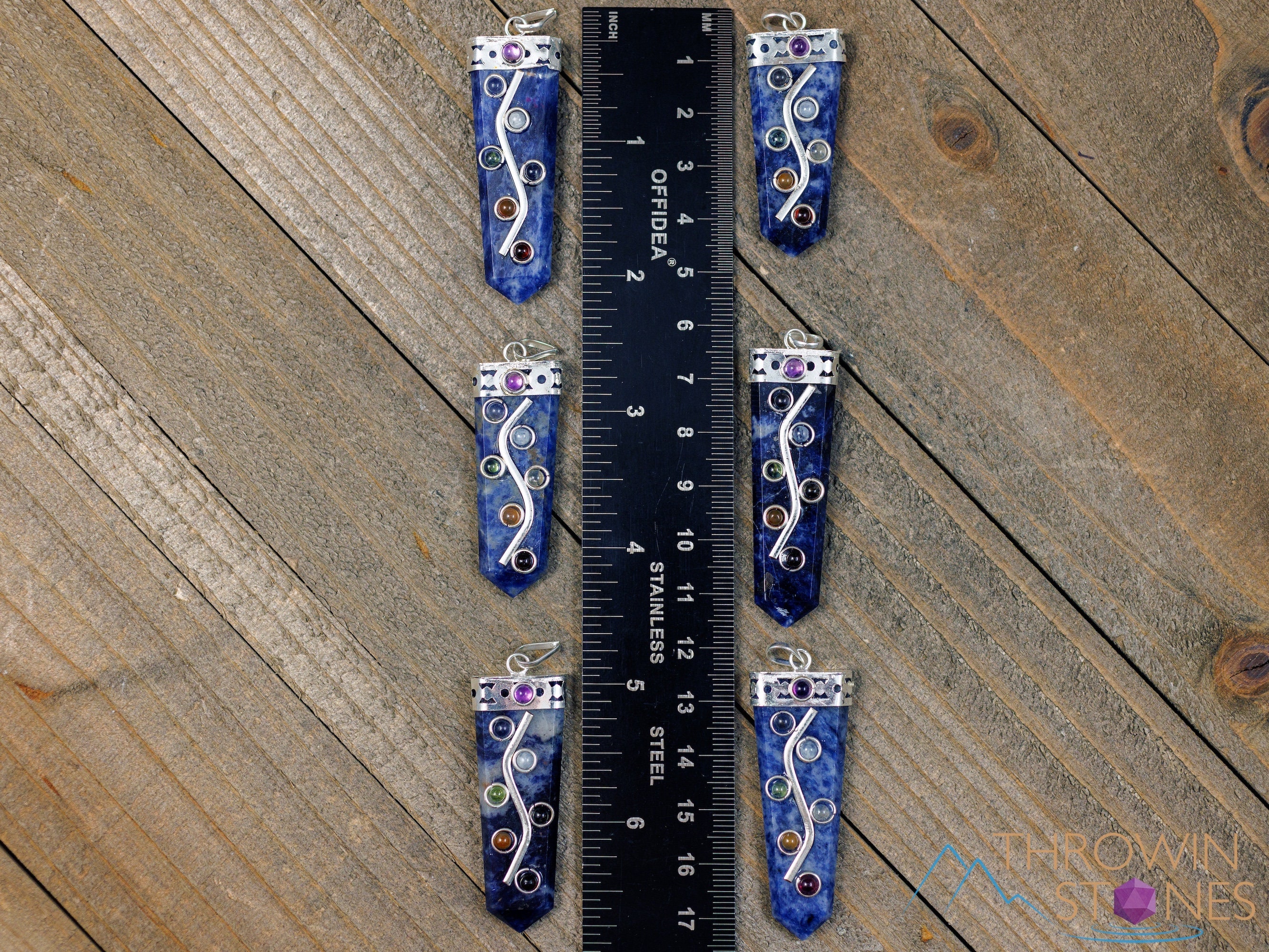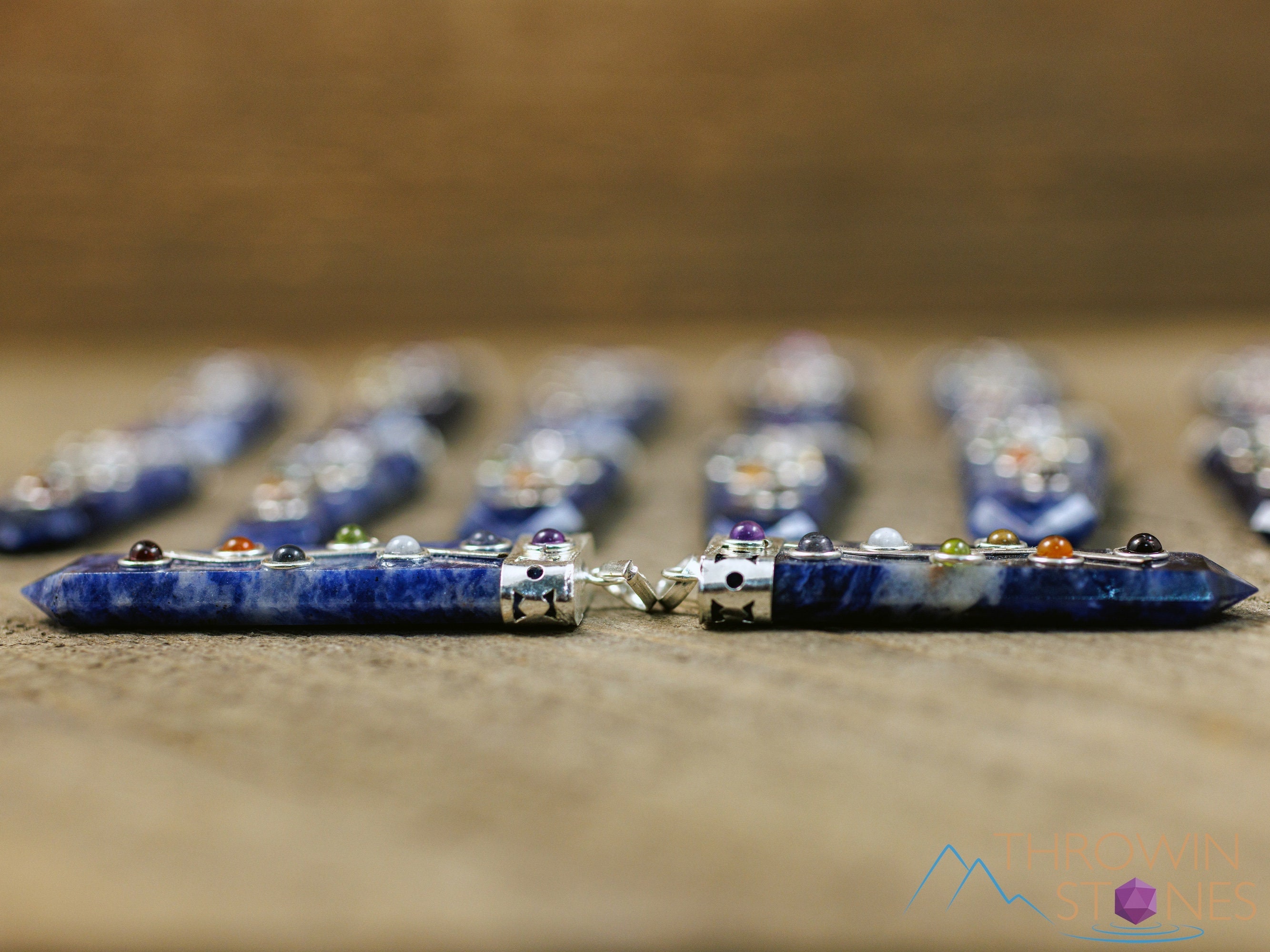 This pendant features seven stones that connect with the seven chakras: Amethyst, Iolite, Moonstone, Peridot, Citrine, Carnelian, and Garnet, aligned atop a Sodalite crystal point.
