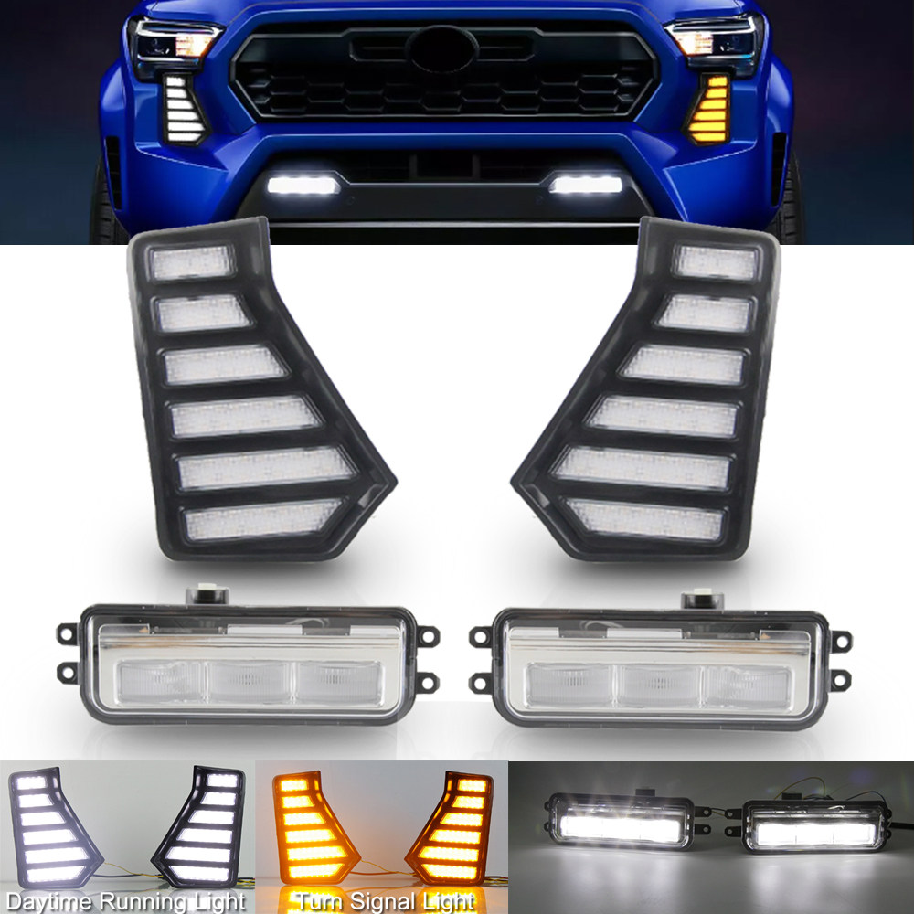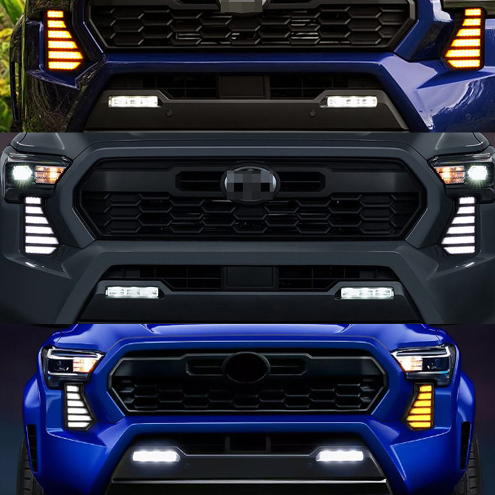 - This page features one pair (2 pieces) of brand new black lens SWITCHBACK LED front grill DRL turn signal lights + 2x Driver & Passenger Side Fog Light Fit For Toyota Tacoma 2024-2025