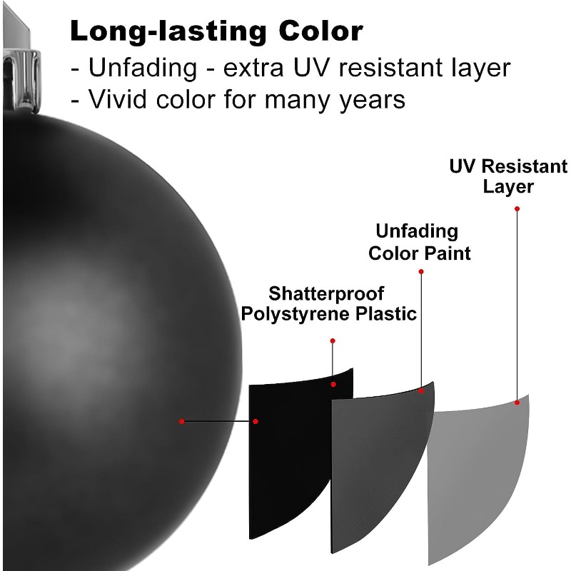 Xmas balls features thick polyethylene material, upgrade plating technology and ultra thick package box. More durable during long shipping and hanging period. Ultra thick package box will prevent the balls from breaking during transportation.