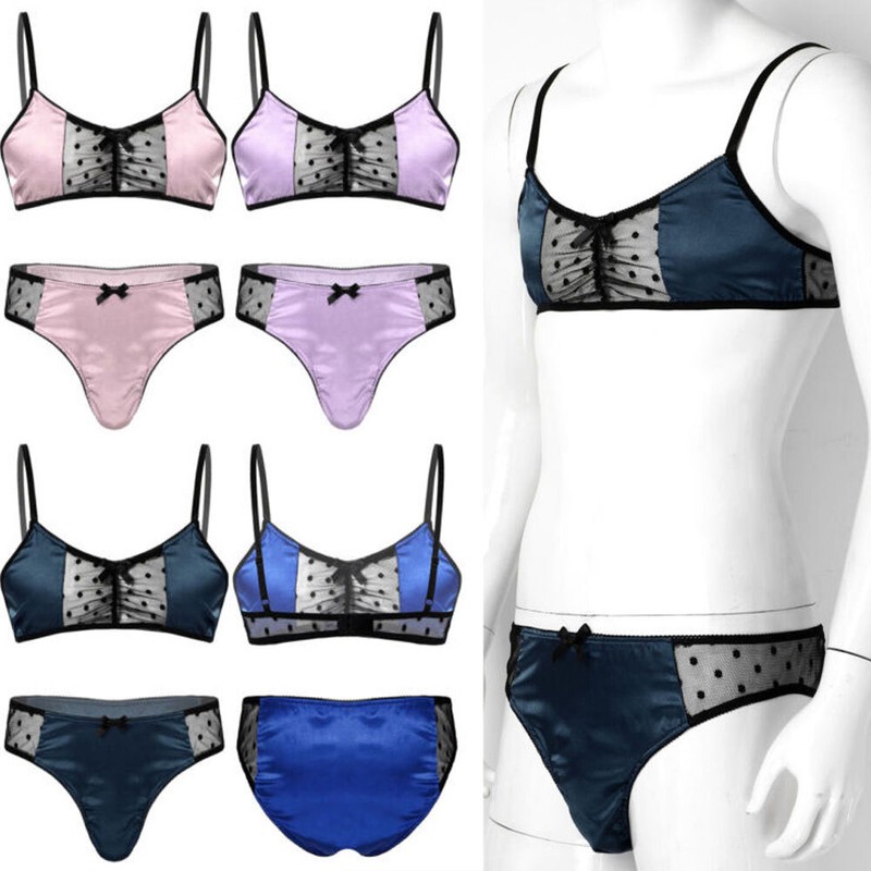US Mens Satin Lingerie Sets Sissy Spaghetti Straps Bra +Briefs Thongs Underwear