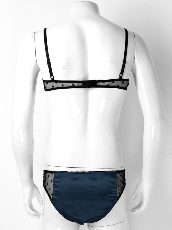 Men Satin Lingerie Suit Sissy Nightwear Sheer Mesh Patchwork Adjustable Spaghetti Strap Bra Tops with Briefs Thongs.