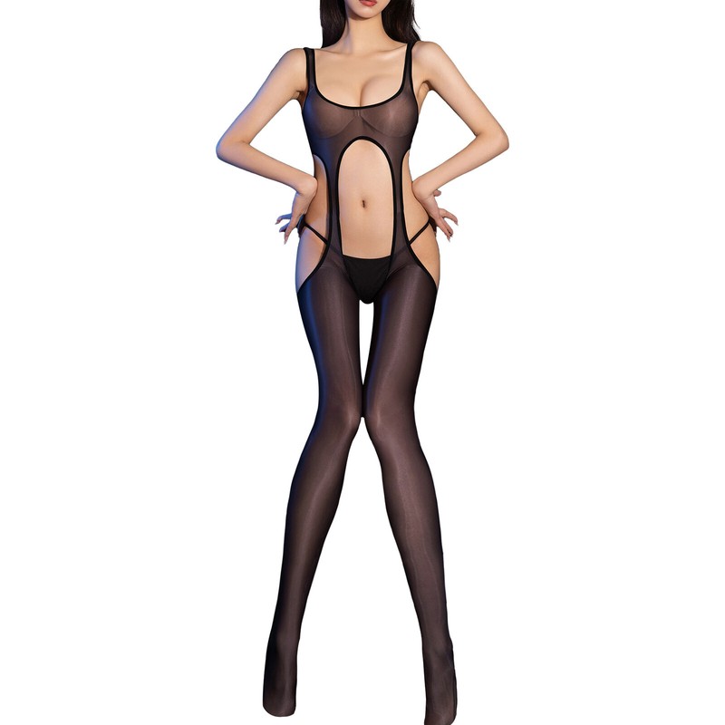 Women See-Through Oil Silk Glossy Bodystockings Full Bodysuit Jumpsuit Lingerie