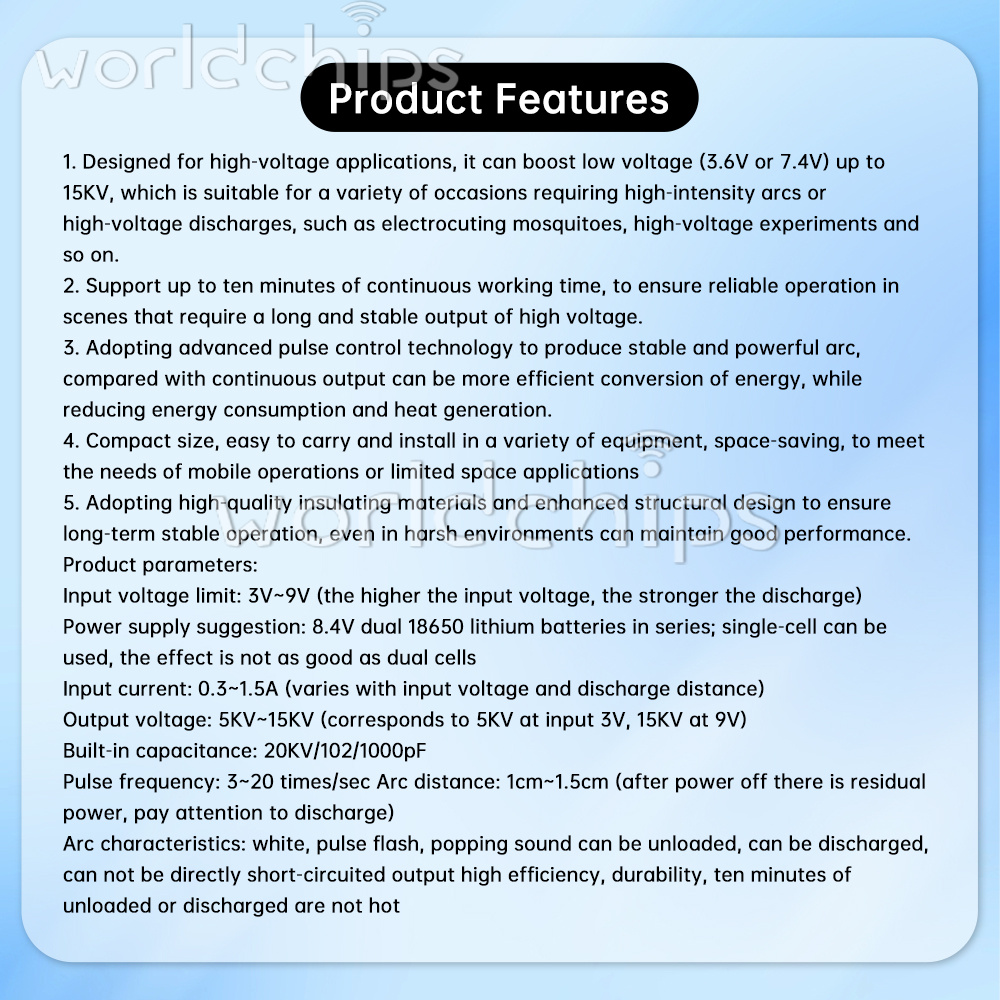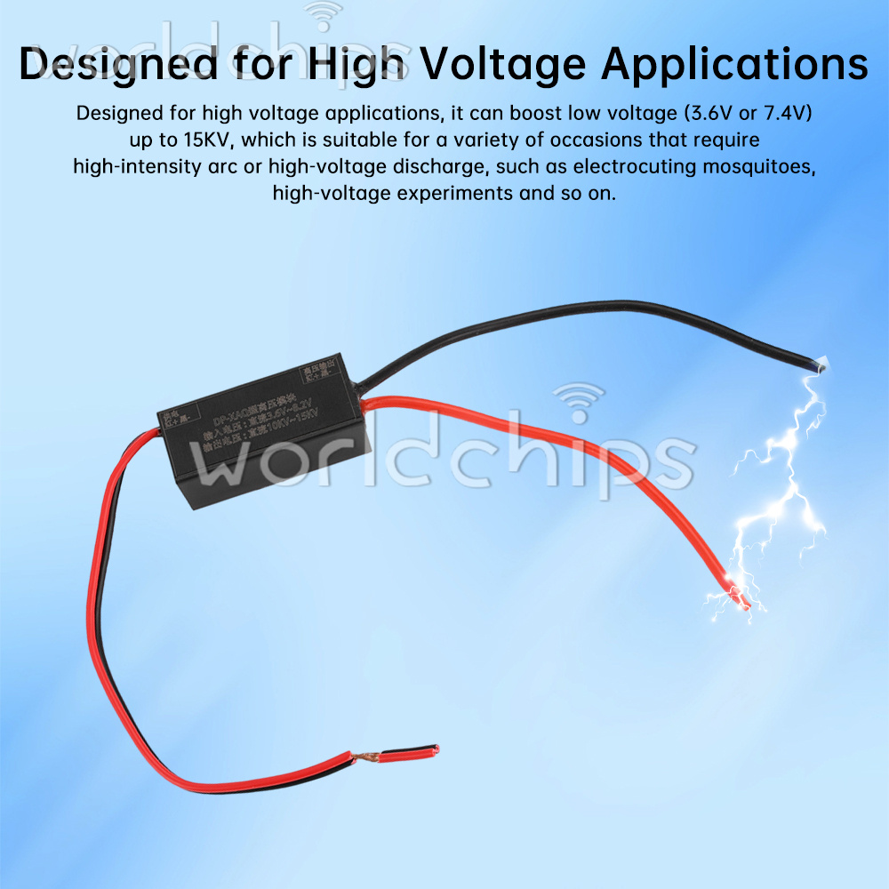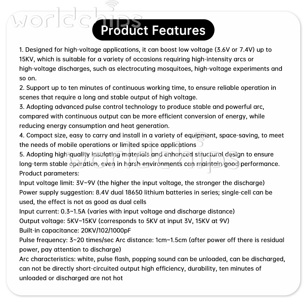 1. Designed for high-voltage applications, it can boost low voltage (3.6V or 7.4V) to 15KV, which is suitable for a variety of occasions requiring high-intensity arc or high-voltage discharge, such as electrocuting mosquitoes, high-voltage experiments and so on.