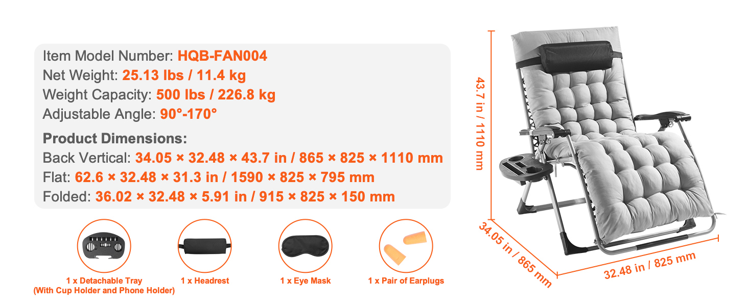 Practical Accessories: Our reclining lounge chair comes with multiple practical accessories including a detachable tray with cup holder and phone stand, and a headrest, eye mask, and earplugs. Enjoy your relaxing time with convenient storage and a peaceful environment.