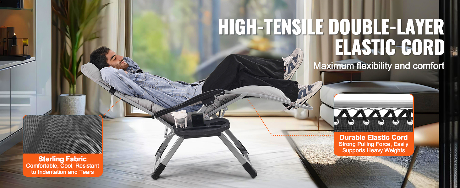 500lbs Heavy-Duty Support: Featuring a robust triangular frame, reinforced square steel tubes, 8mm aluminum locks, and double-layer elastic cords, this 33" zero gravity chair offers exceptional stability and supports up to 500lbs. Ideal for users of all sizes.