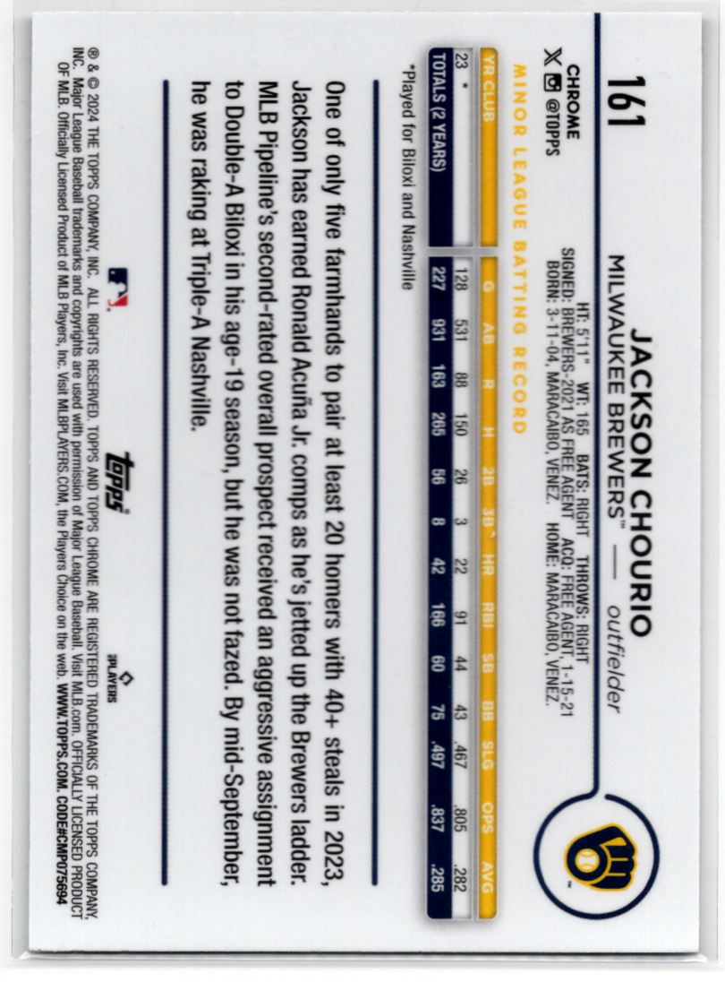 Jackson Chourio #161 2024 Topps Chrome Raywave Refractor RC Milwaukee Brewers
