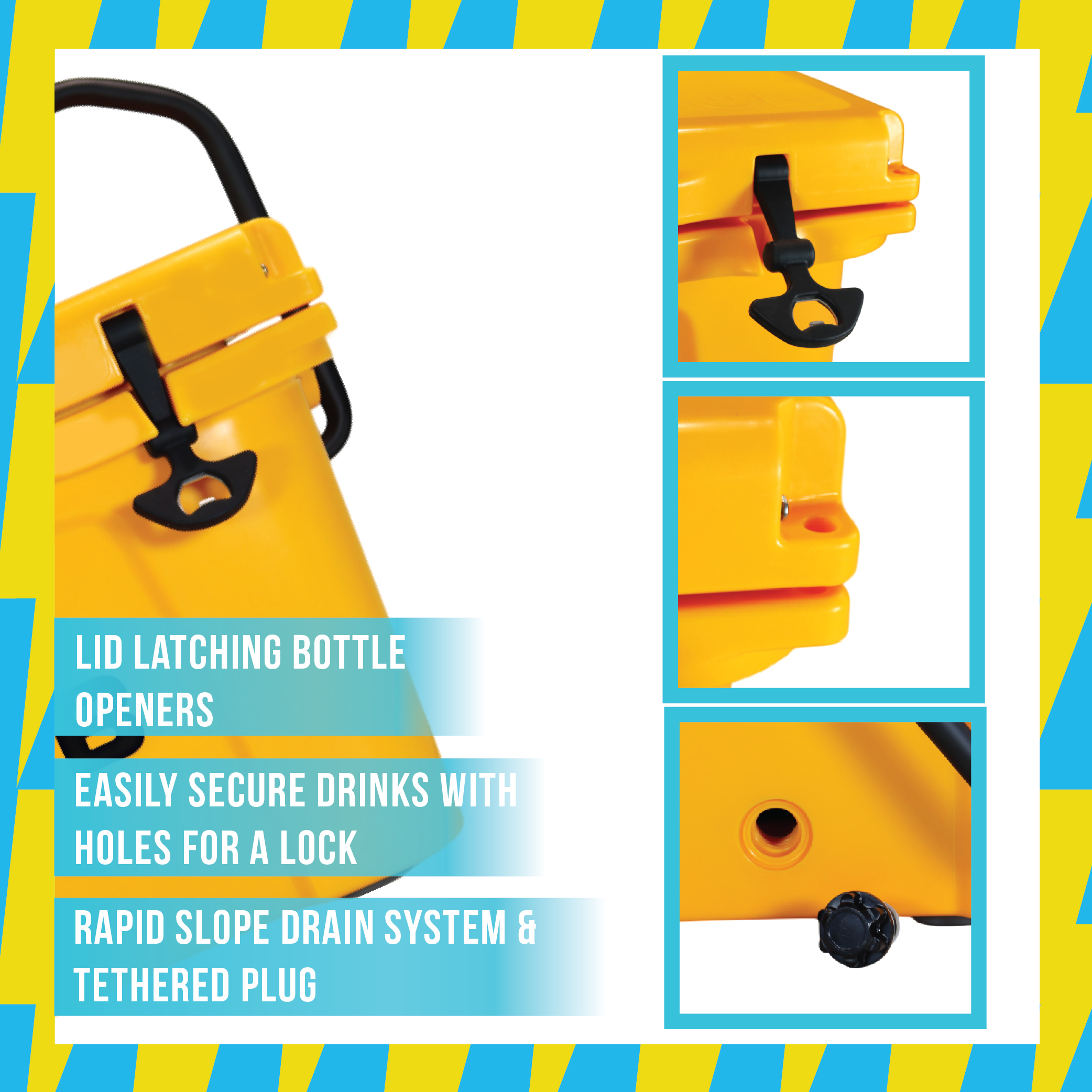Get the party started with "The Wingman" 25qt cooler - designed to hold a 30 pack, snacks and plenty of ice. Keep 'em chilled with Pressure-injected commercial-grade polyethylene extra thick insulated walls and lid. Crack open some pops & brews with custom lid latching bottle openers.