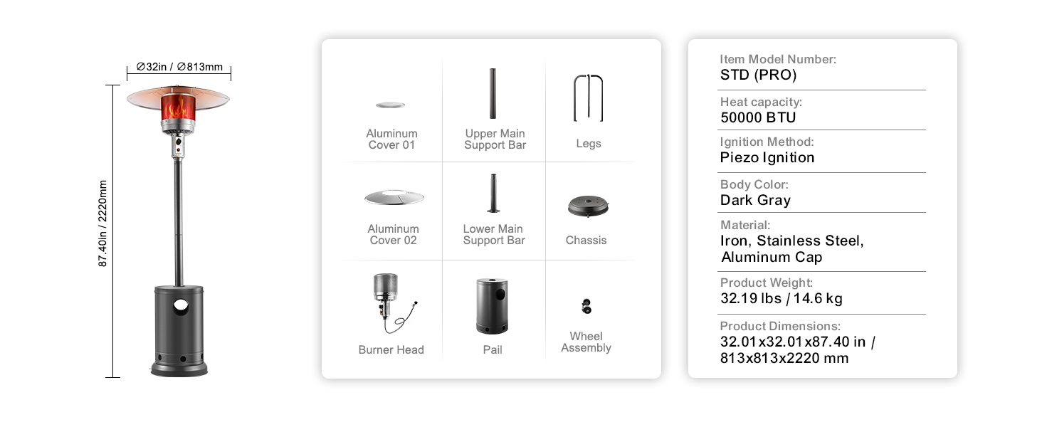 Fixed Propane Heater features durable stainless steel, tilt auto-shutoff for safety, and wheels for easy mobility. Enjoy cozy warmth in your patio, courtyard, or outdoor camping with ease and style!