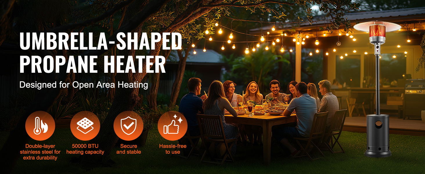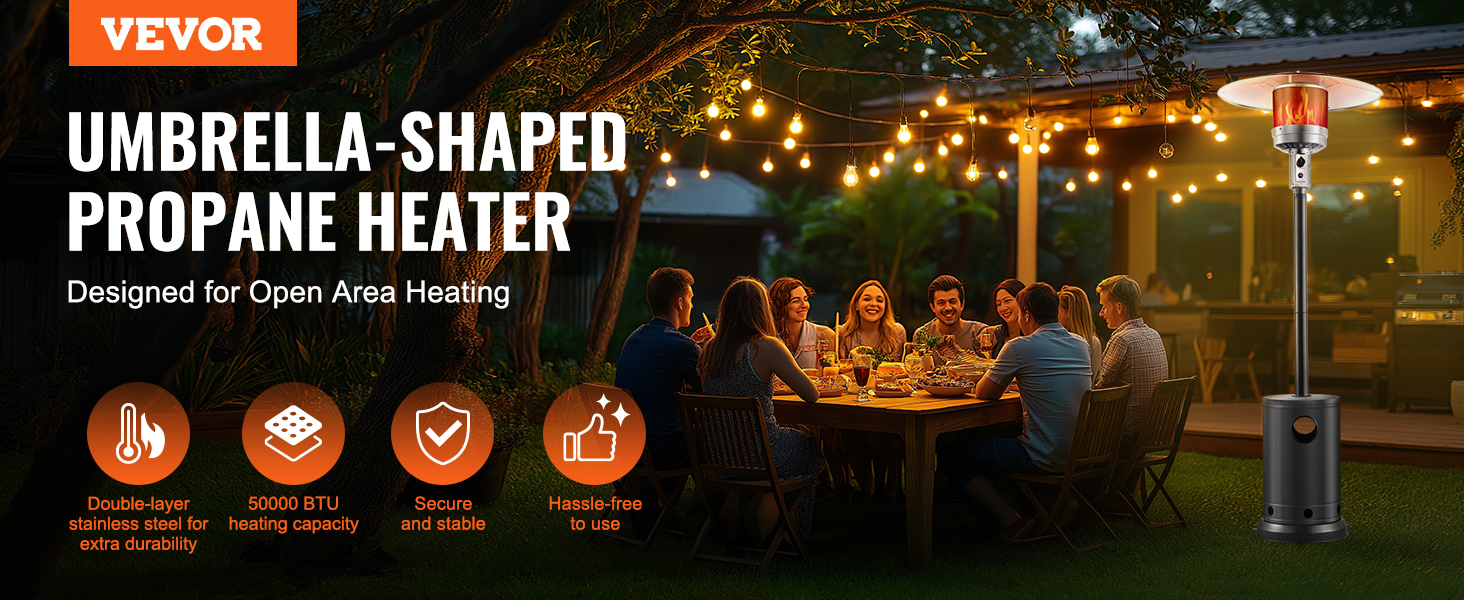 VEVOR Fixed Propane Heater features durable stainless steel, tilt auto-shutoff for safety, and wheels for easy mobility. Enjoy cozy warmth in your patio, courtyard, or outdoor camping with ease and style!