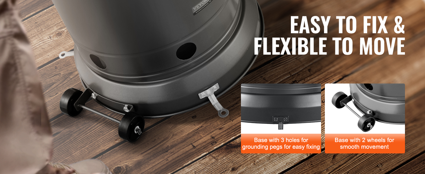 Convenient Use: Equipped with two wheels for easy mobility, the outdoor propane heater is simple to move wherever needed. Complete accessories and straightforward instructions make installation quick and easy, even for beginners.