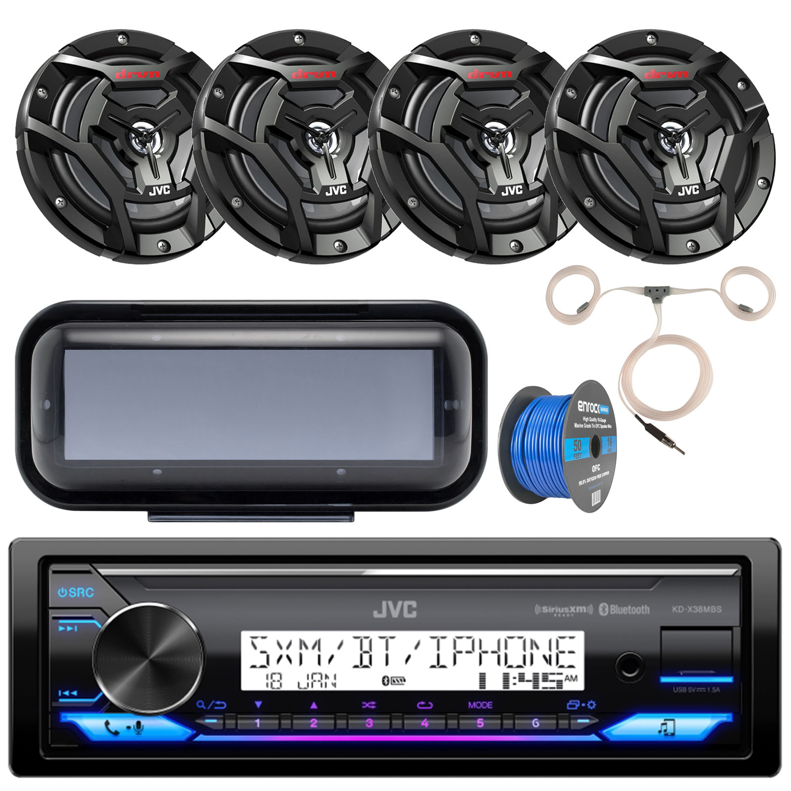 Bay Boat Audio Package: JVC KD-X38MBS Marine Single DIN AM/FM Bluetooth SiriusXM Receiver, Single DIN Radio Cover - Black, 4x JVC CS-DR6200M 6.5" Marine 2-Way Black Speakers, Antenna, Speaker Wire