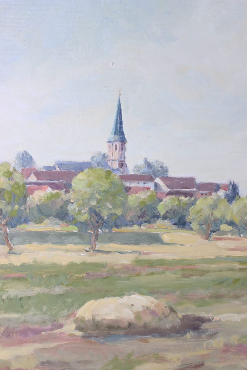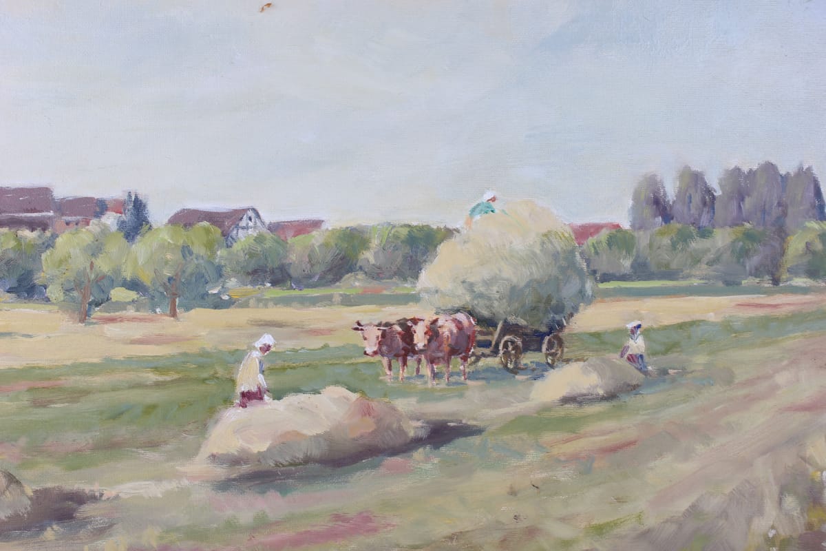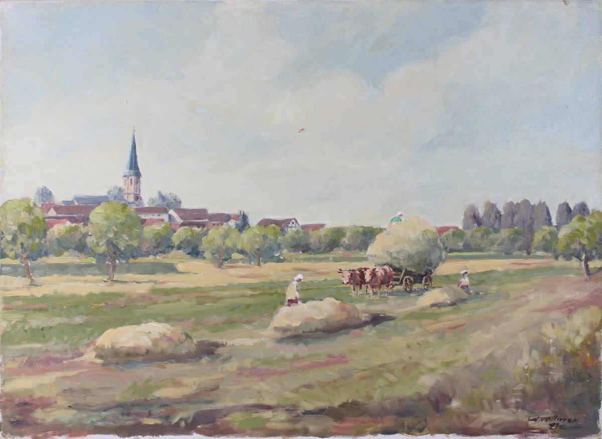 Heuernte Ochsengespann vor Dorfansicht Ölgemälde signiert W. Vollmer