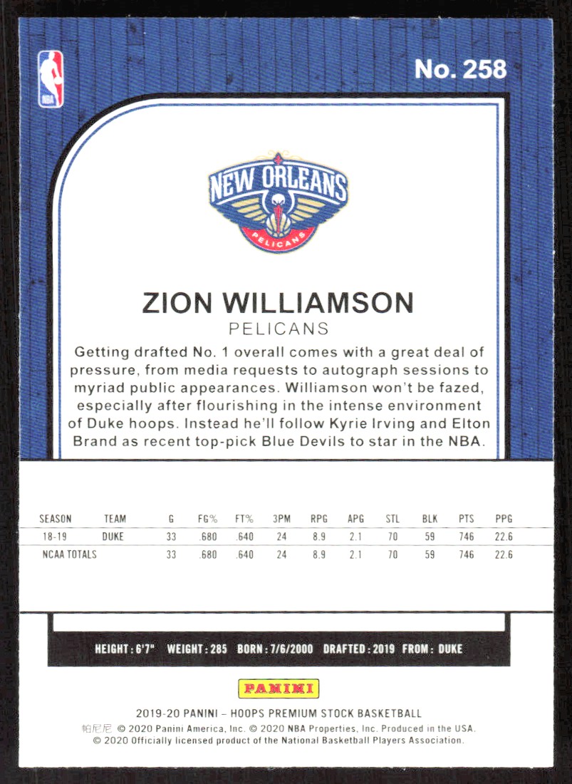 2020-21 10181D NBA HOOPS Zion Williamson Rookie New Orleans Pelicans #1