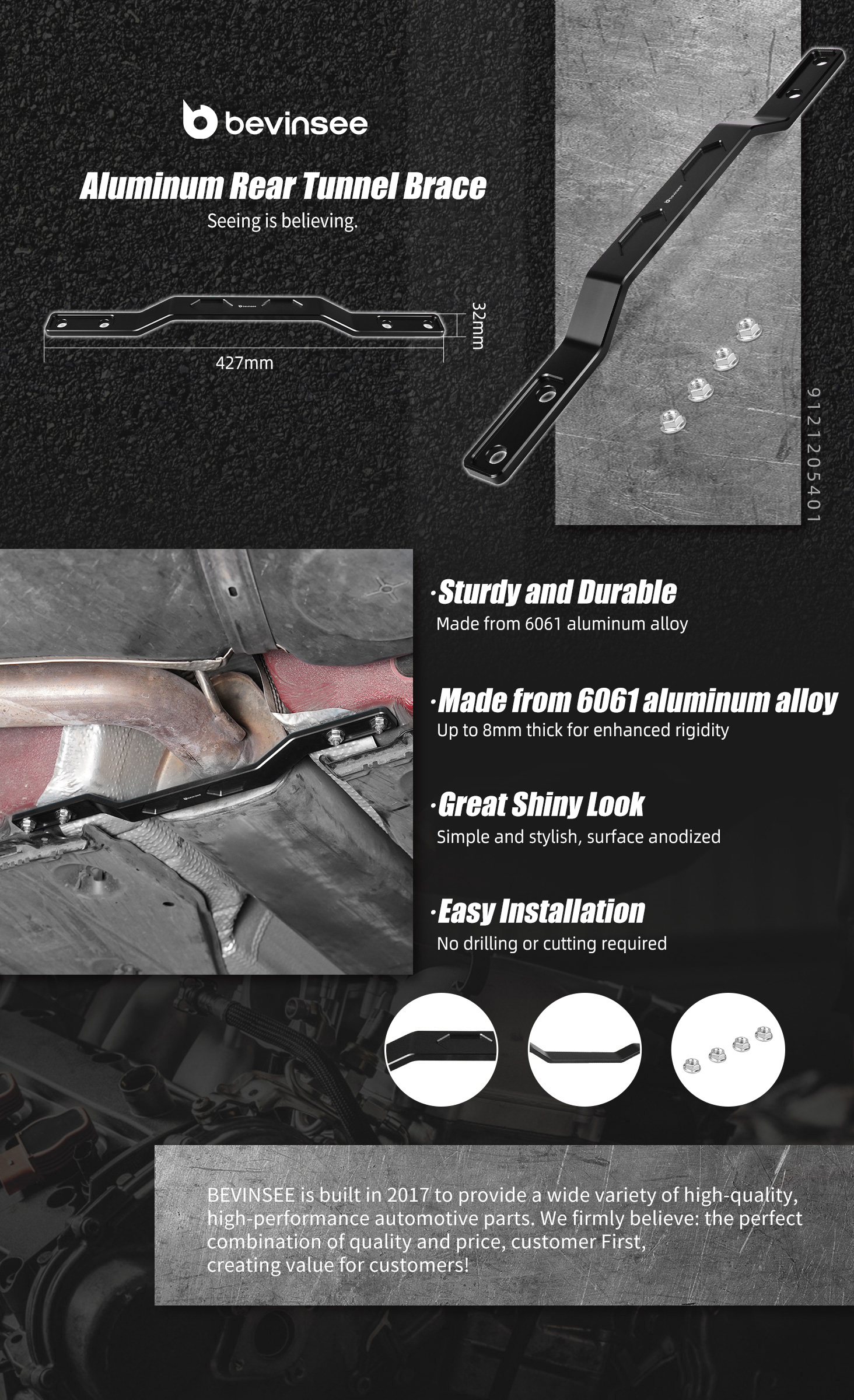 【Enhanced Strength】Upgraded from the factory thin stamped-steel to a sturdy 8mm thick 6061 aluminum alloy, BEVINSEE tunnel braces reinforce the body's weaker points, reducing chassis flex under high loads.