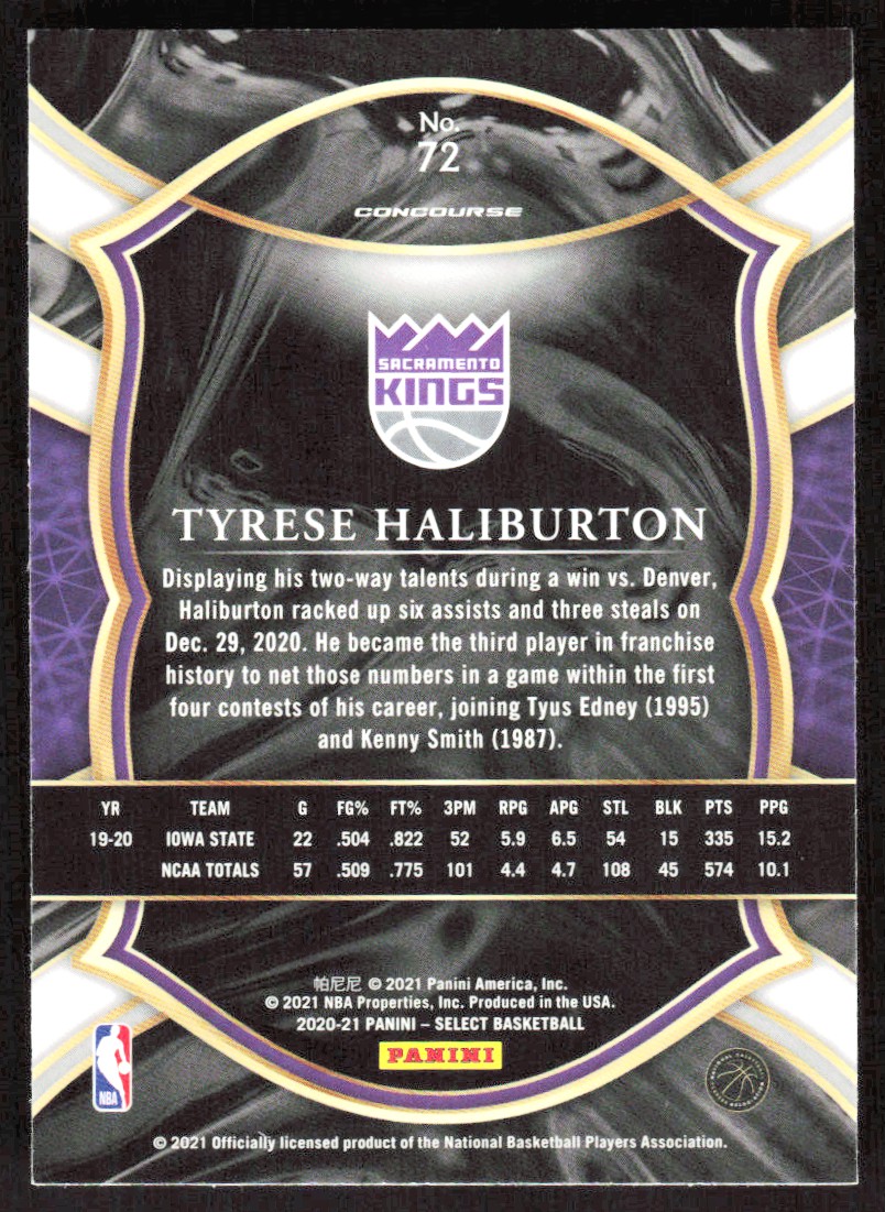 2020-21 10814D Panini Select Tyrese Haliburton Rookie Sacramento Kings #72
